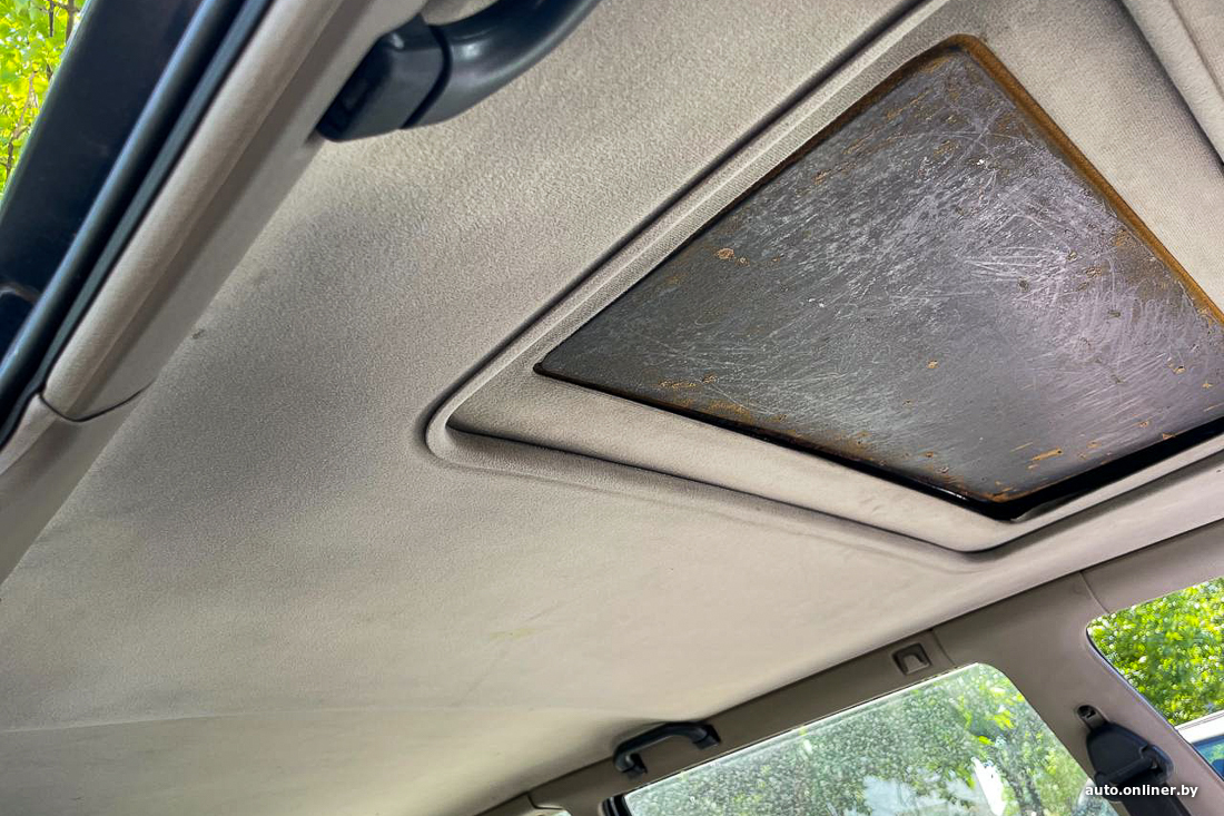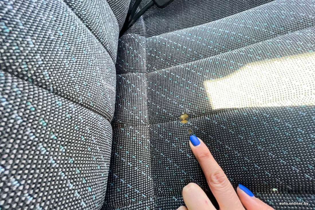Салон в очень неплохом состоянии: нашли лишь небольшую дырочку в сиденье. Правда, потолок провисает, и люк не открывается.