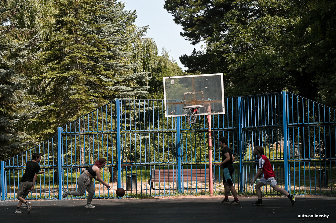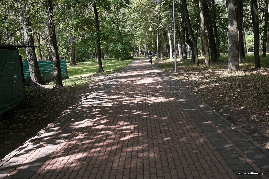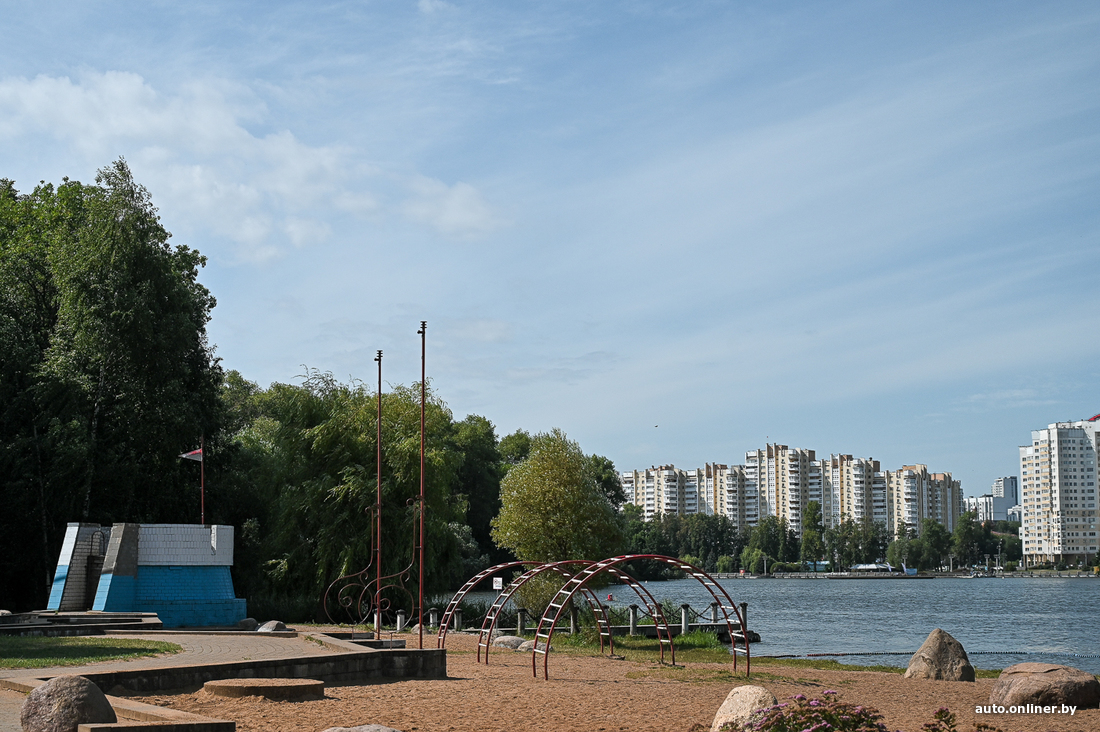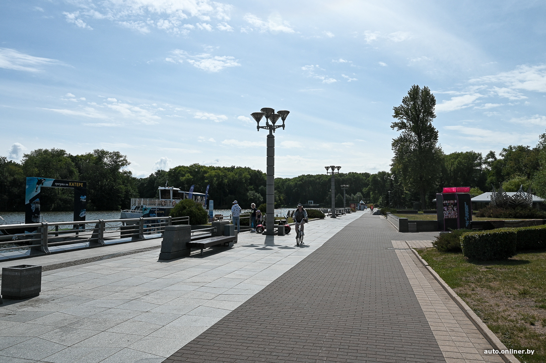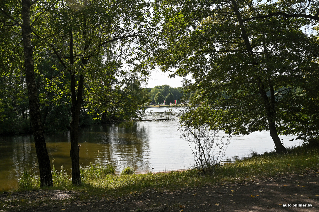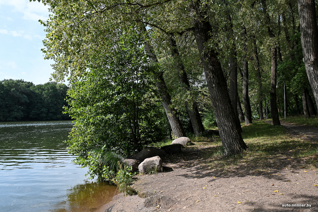 Не важно, ехали ли вы дорожками по улице Веры Хоружей или добрались маршрутом через улицу Нововиленскую, начинать путешествие вокруг Комсомольского озера можно от Дворца детей и молодежи. Здесь можно купить воды в дорогу или сразу мороженого, а затем постепенно спускаться к воде. Вдоль берега проложены аккуратные дорожки, где прогуливаются пешеходы, в том числе мамы с колясками. Разгоняться не надо, да и не хочется — жара.