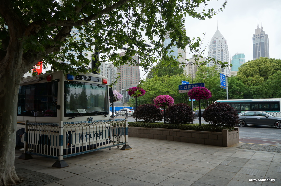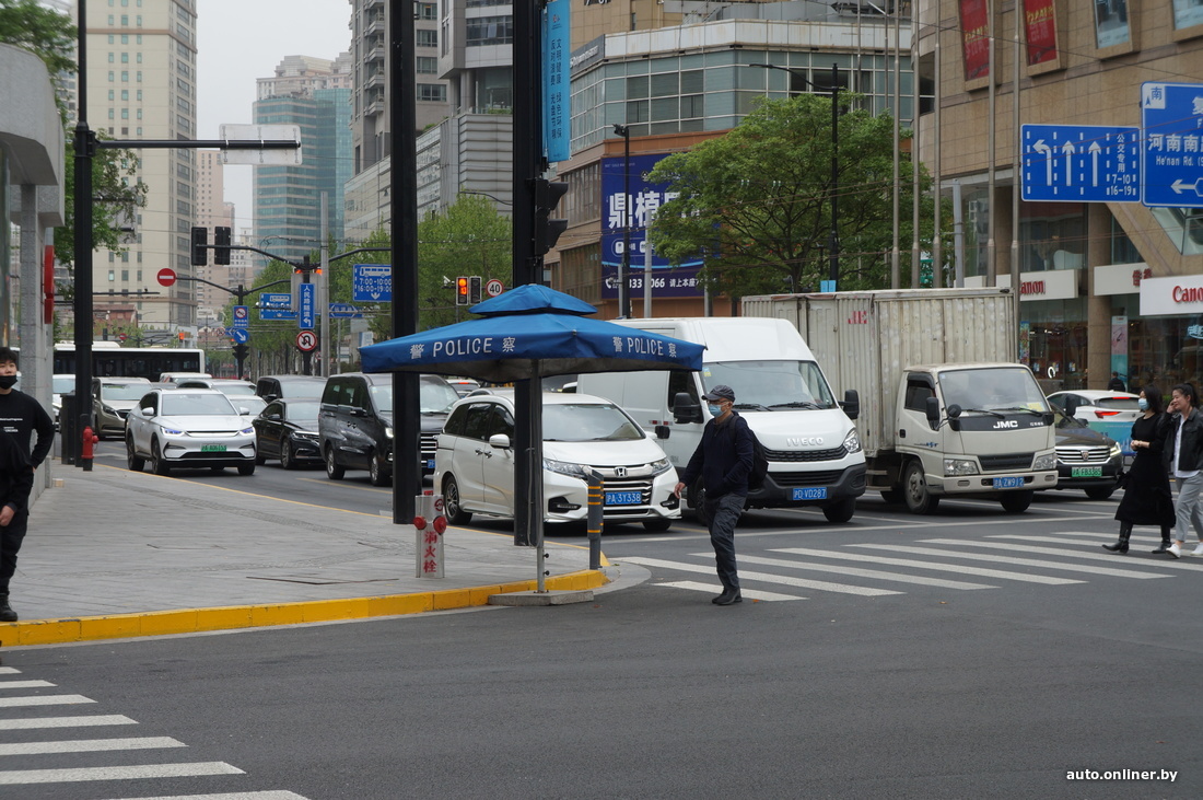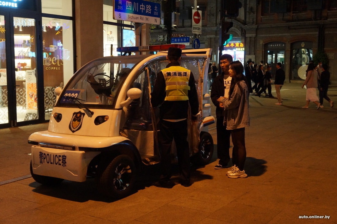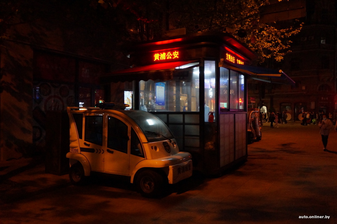 В целом контроля в Шанхае довольно много. У общественных и популярных среди горожан мест — концентрация полицейских. Там они передвигаются на небольших автомобильчиках, больше похожих на гольф-кары. На некоторых перекрестках стоят домики, в которых дежурят ребята в форме.