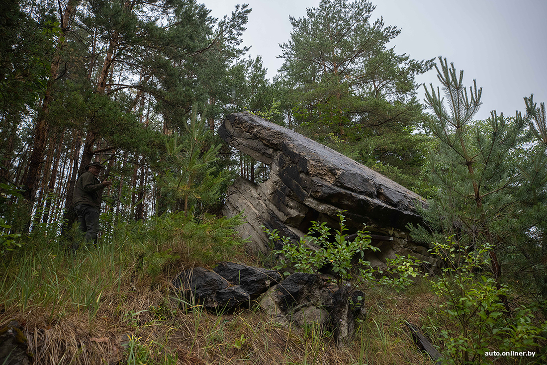 Выдвигаемся в сторону Сутьково. По дороге за деревьями (54.38198, 26.37483) спрятан перевернутый ДОТ. По всей видимости, его хотели взорвать, но избавиться от бетонной постройки так и не получилось.