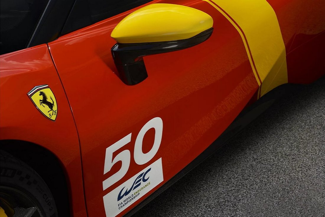 Основной цвет кузова (красный Rosso Le Mans) сочетается тут с желтыми полосками, черной крышей, акцентами из углепластика, а также с логотипом чемпионата по гонкам на выносливость (WEC) и цифрой 50, недвусмысленно намекающей на время отсутствия итальянской «конюшни» в топовом классе гонки.