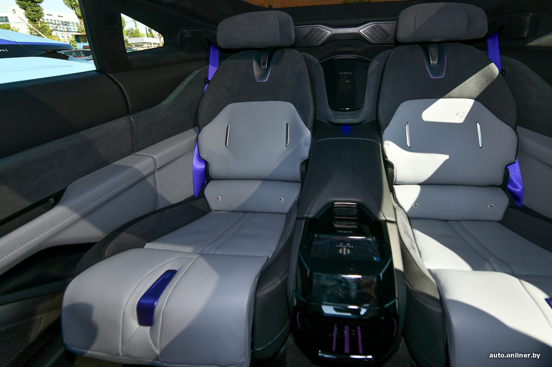 Внутри электрокара все оформлено не менее странно и футуристично. В глаза бросается одинокий большой центральный дисплей медиасистемы (поворачивается на 90 градусов, как в моделях BYD), роль приборов здесь выполняет проекционный экран. Даже руль при всей простоте его формы постарались сделать максимально навороченным, с сенсорами. Удивительно, как за счет дизайна и комбинирования материалов «китайцам» удалось добиться ощущения премиальности в салоне.