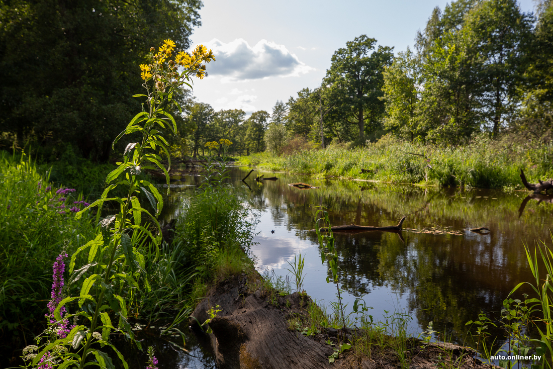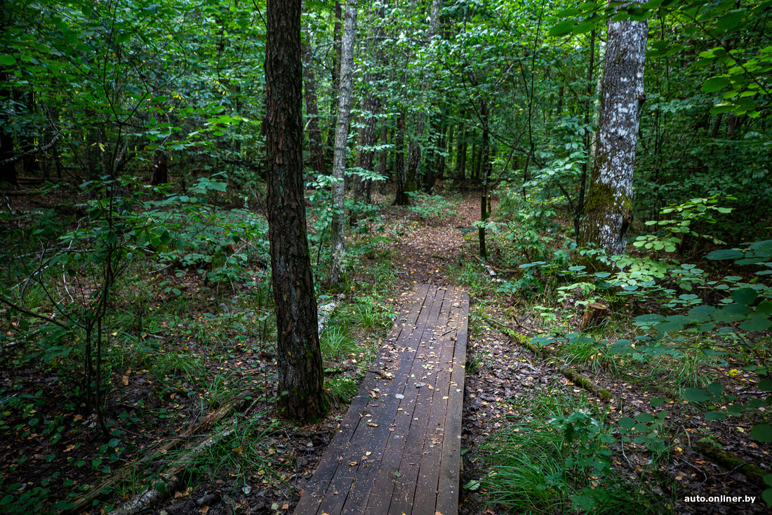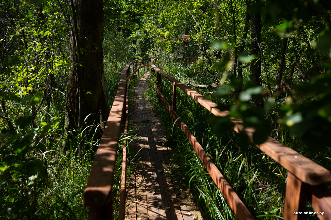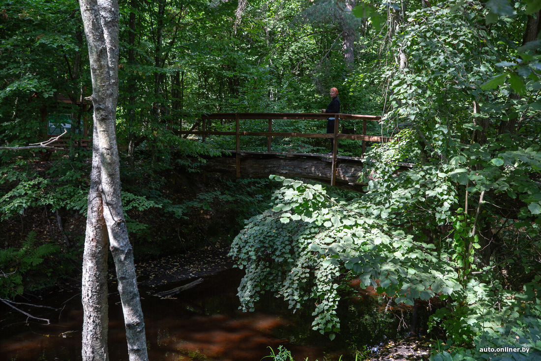 Перекусываем и отправляемся в места, более подходящие для романтических прогулок. Нас ждет экотропа «Царь-сосна» — к ней ведет деревянный мостик через канал Бычок (примерные координаты — 52.007444, 27.866942).