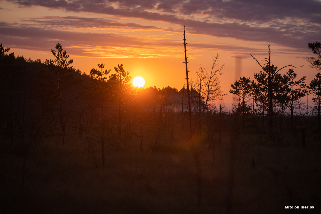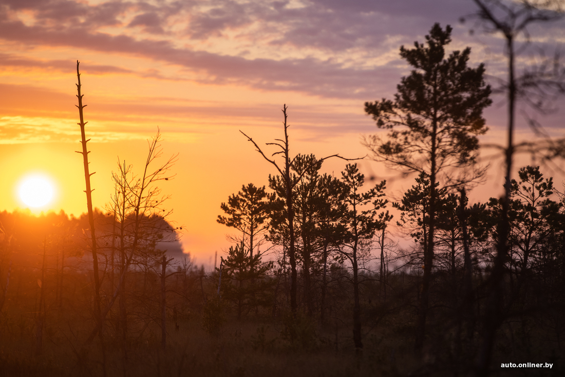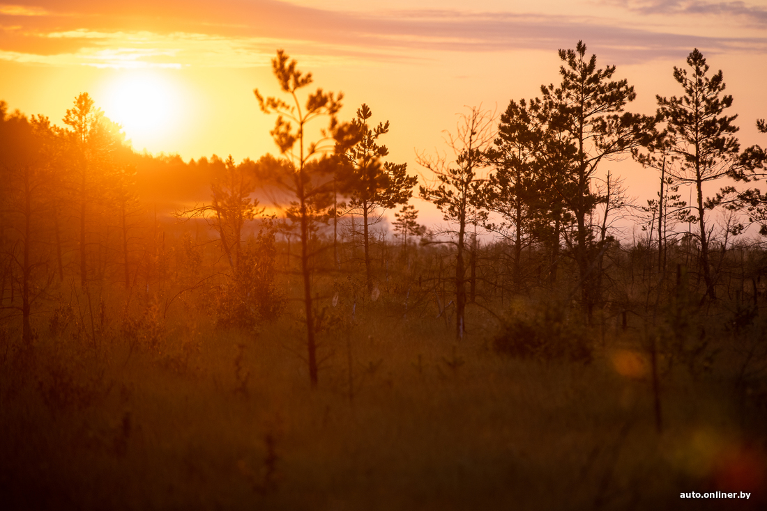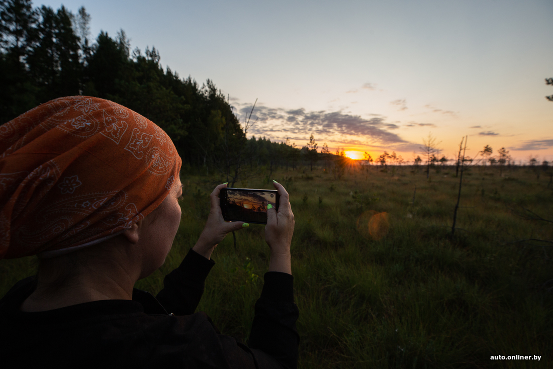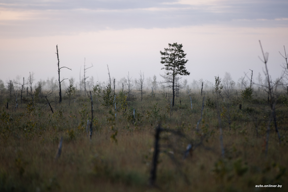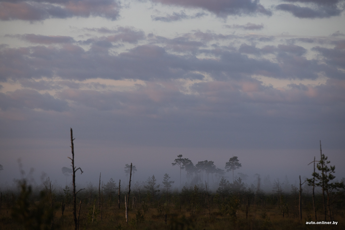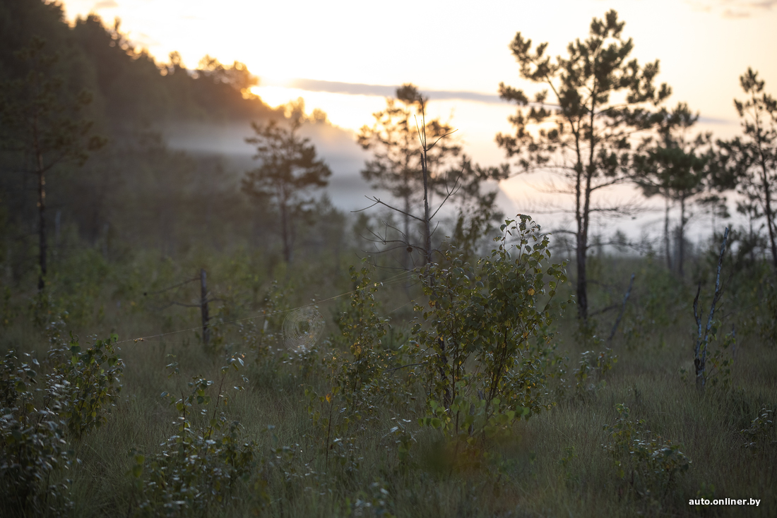 Вересковые поляны не пахнут, но выглядят крайне живописно. А вон небольшая березовая роща. Правда, кто-то успел осквернить ее парочкой бутылок и пакетов. Ольга тихо ругается и спешно собирает мусор к себе в рюкзак. Мы торопимся встретить рассвет так, чтобы это запомнилось на всю жизнь — прямо посреди болота.