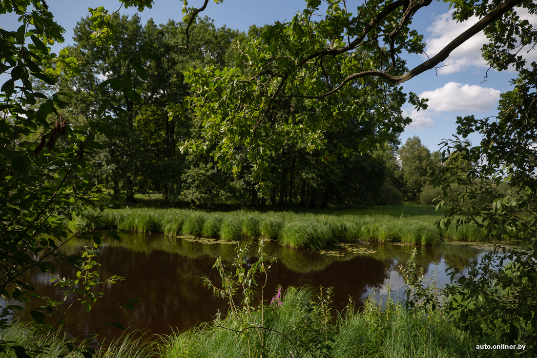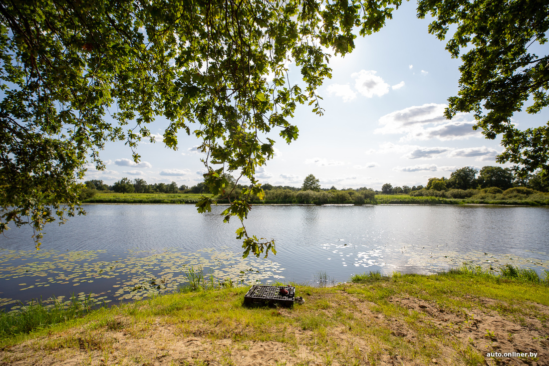 А мы по дороге делаем привал в очень живописном месте для рыбалки (ловить рыбу здесь можно за деньги, зато плавать, если локацию никто не арендовал, сколько влезет). Вот его координаты — 52.102366, 28.195260. Но будьте аккуратнее: здесь довольно глубоко. В сезон паводка местная беседка уходит под воду — по ней и дубу, стоящему рядом, можно рассмотреть, до какого уровня поднимается вода.