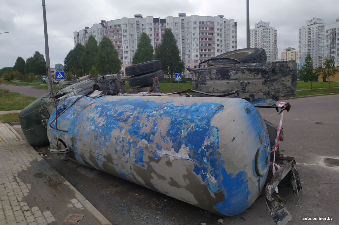 Место, где покоится грузовая цистерна, — довольно тихое. Улица Некрашевича — тупиковая в относительно недавно возведенном микрорайоне Брилевичи. Рядом лишь пустырь, железная дорога и не сильно оживленный Студенческий парк. С одной из сторон — ряд жилых высоток, окружающих детский сад.