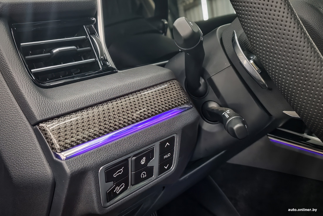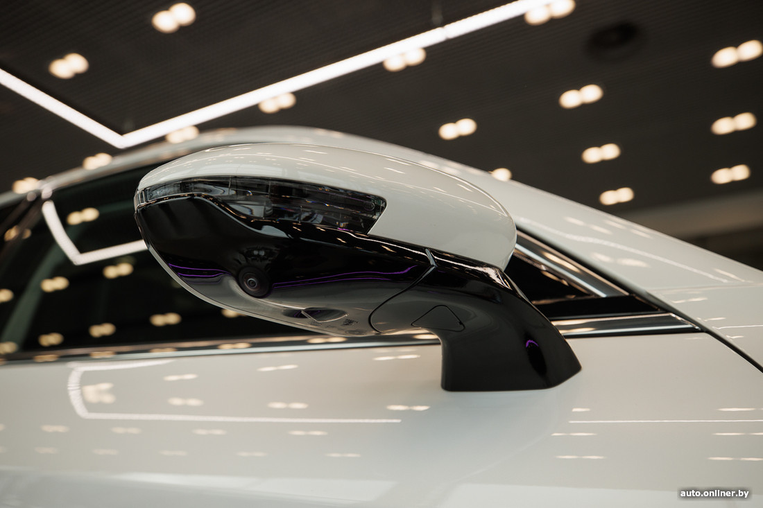 Комплектация довольно богатая. Выделим лишь основные опции: приветственный свет, интеллектуальное управление дальним светом, автоматическое выравнивание фар, комбинированные светодиодные фонари, подогрев зеркал, накладки на пороги со светодиодами, панорамная крыша, стеклоподъемники с защитой от защемления, крышка багажника с функциями комфортного закрывания и сенсорного открытия, двойное остекление передних дверей, парктроники и камеры (спереди и сзади).