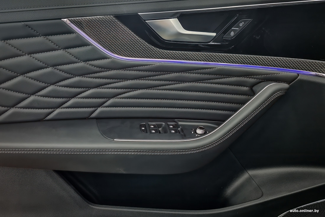 В салоне выделяются: кожаная отделка сидений (Nappa + Alcantara), электрорегулировка водительского кресла в 12 направлениях с функцией памяти положения, подогрев и вентиляция передних сидений, подогрев задних, помощь водителю при посадке и выходе, 253-цветная система окружающего освещения, декоративные элементы в стиле карбон, акустика Bose с 12 динамиками, два 12,3-дюймовых сенсорных дисплея, подрульные лепестки, зеркало заднего вида с мультимедиа, 2-зонный климат-контроль, датчик качества воздуха, ионизатор, фильтр пыльцы.