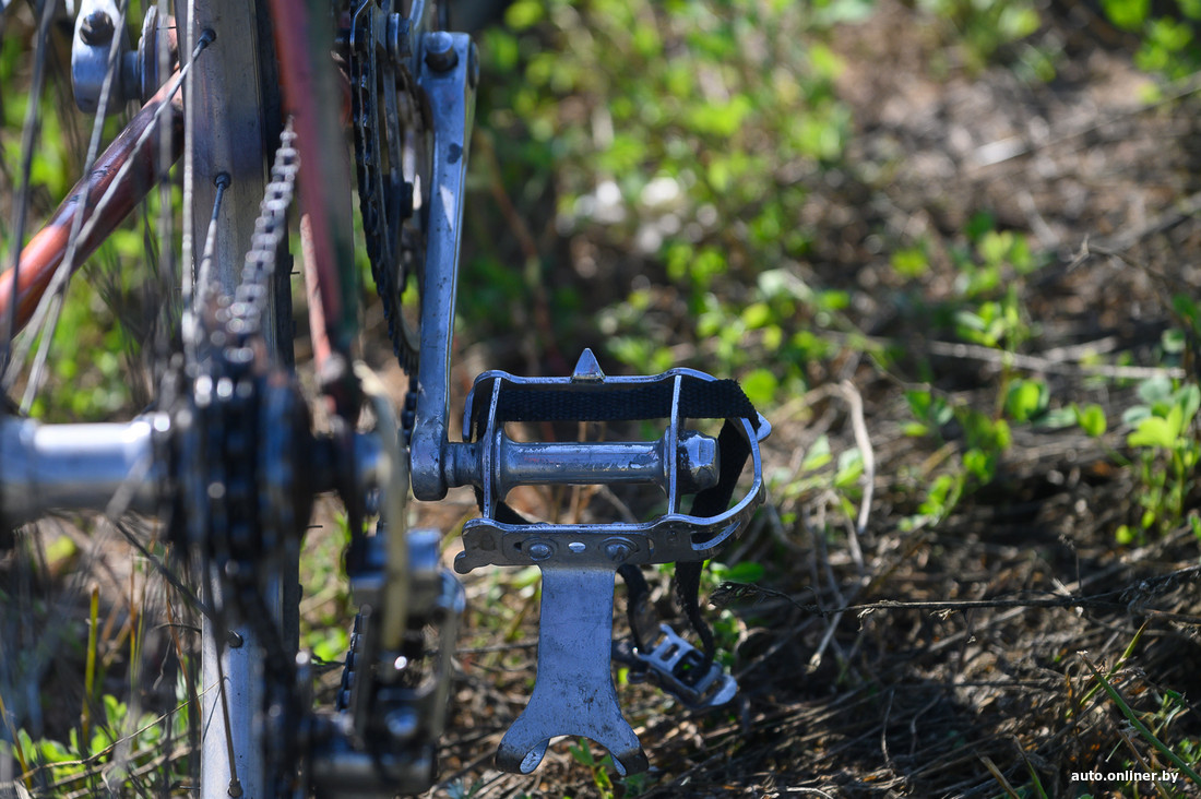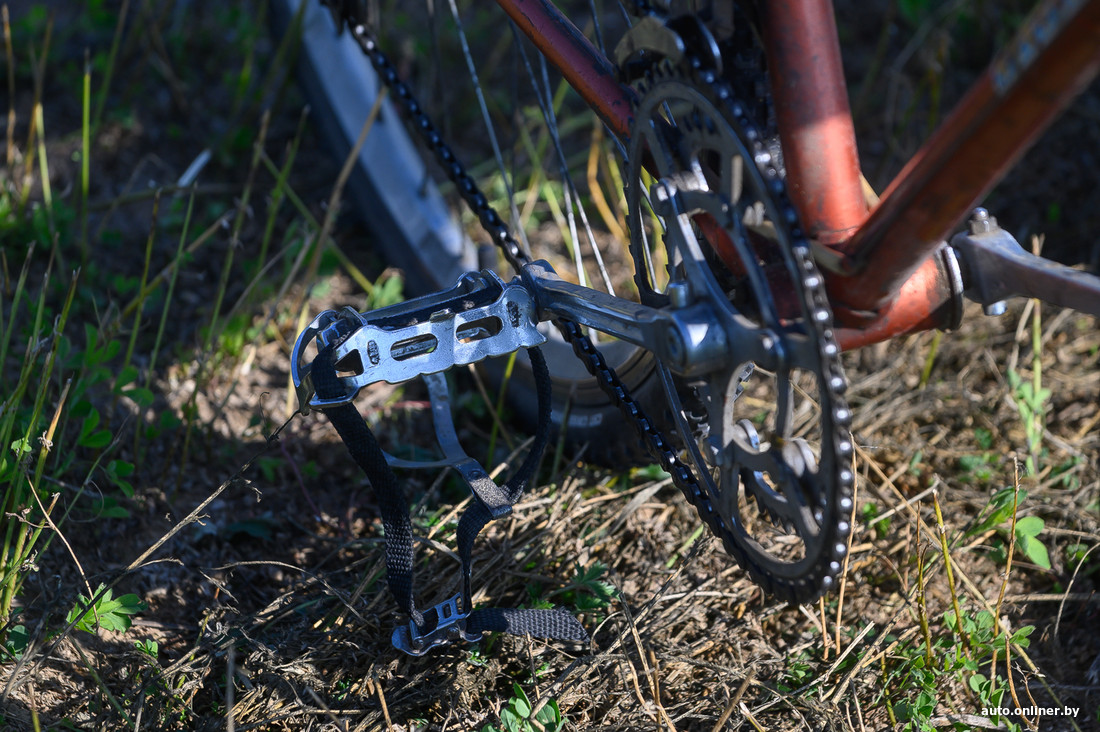 Со «Старт-Шоссе» еще нужно познакомиться, притереться друг к другу. И один из принципиальных моментов — педали. Понятно, что на Borant, как и в повседневности, крутили в контактах. Также понятно, что на ХВЗ их не было, а были туклипсы, для которых нужна соответствующая велообувь. Как правило, ее делали из кожи, к подошве приклепывались дюралевые шипы: пластина попадала в прорезь, сверху все это зажималось ремнями — все, ногу не выдернешь. Сегодня такой способ кажется очень сложным и опасным. Из контактов выстегиваешься простым поворотом пятки, а здесь попробуй еще ремешок на ходу ослабь, потом ногу выстегни, а дюралевые пластины, как рассказывают знающие люди, от нагрузки нормально так сжимались и клинили в неподходящий момент — в общем, ужас. Впрочем, такой же ужас наверняка испытывают люди, никогда прежде не ездившие в контактных педалях.