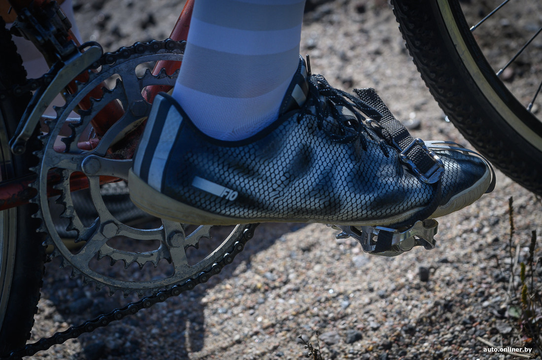Короче говоря, побороли избалованность и педали на ХВЗ оставили родные. Обуви под туклипсы, конечно, не нашлось, встегиваться было нечем, поэтому просто подобрали что-то, что нормально влезает в педаль, затянули ремешок и поехали.