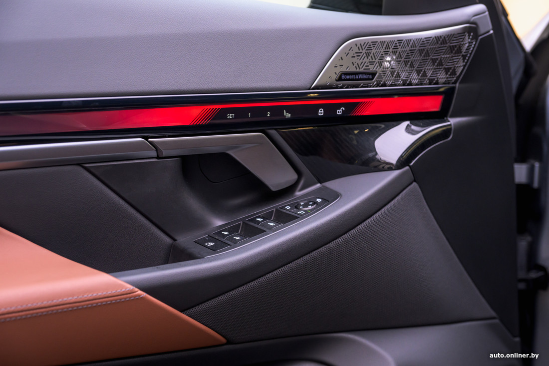 По периметру салона — атмосферная подсветка. Теперь она меняется в зависимости от режима езды, загорается красным при включенной «аварийке». На линии подсветки на дверях запрятано несколько сенсорных кнопок для управления креслом и блокировкой дверей (называется Interaction Bar).