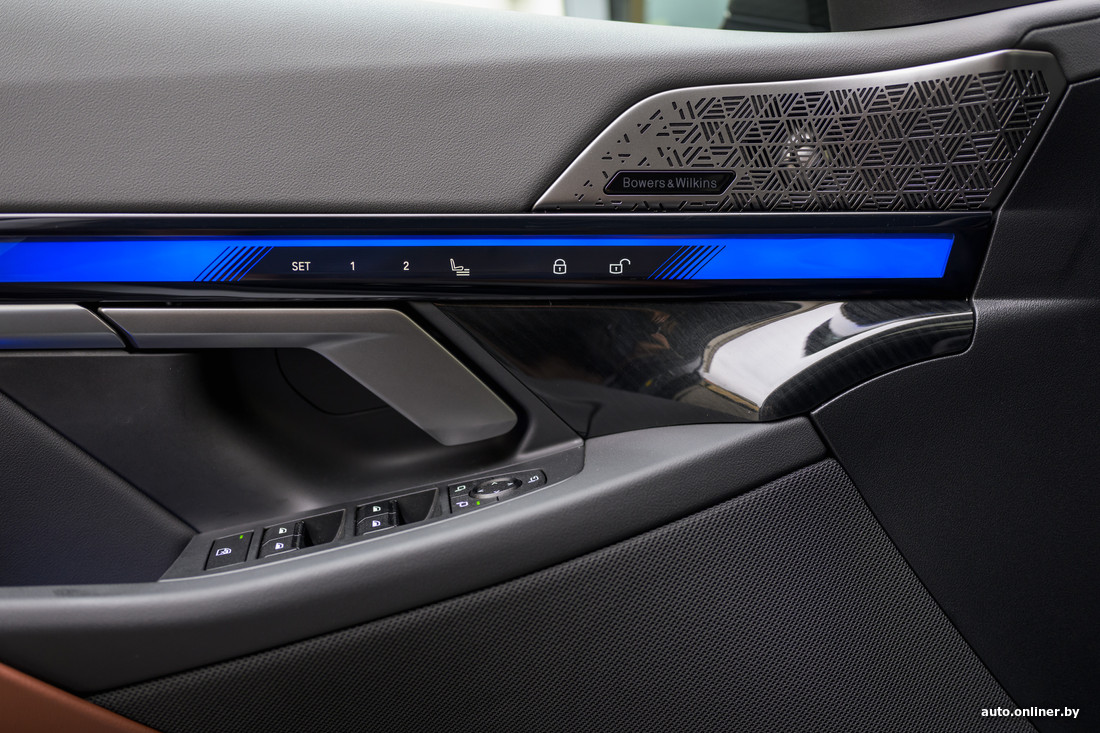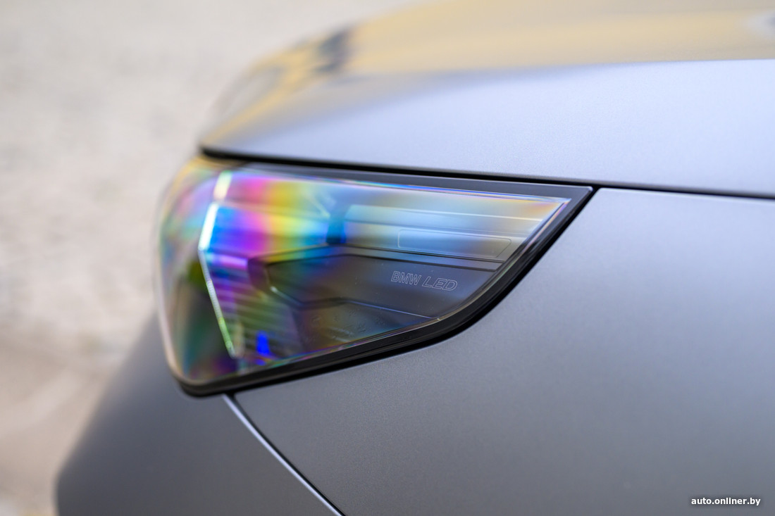 Примечательно, что в EV оставили линии решетки, хотя ее как таковой и нет. Элемент узнаваемого стиля — не поспоришь. Появилась адаптивная «двухэтажная» оптика. Задние фонари в своем дизайне делают реверанс X5 или X6.