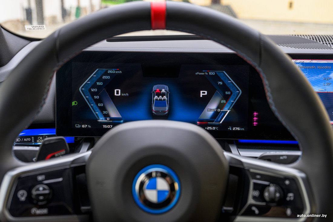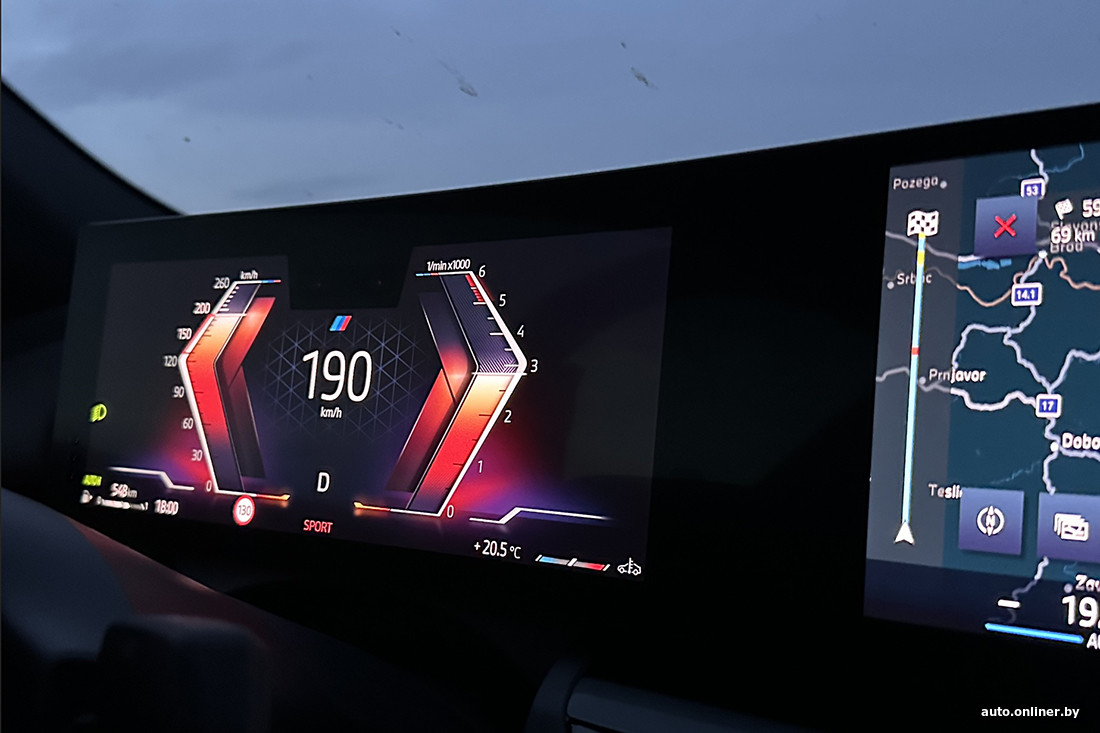 Нам достался самый сок всей линейки — электрический i5 M60 мощностью 601 л. с. Покидать Белград как-то даже приятно. Не то чтобы город совсем неинтересный, скорее дело в машине. С ограничением в 50 км/ч она не способна показать все, на что способна. Только тронулся со светофора — и уже, считай, нарушитель. Разгон до 100 км/ч за 3,7 секунды — это не шутки. И это при стандартном режиме. Набор скорости в этом «метеоре» стремителен, сопровождается не менее ураганным звуком в салоне. Говорят, над ним поработал отдельно нанятый композитор. Этот звук не похож на рев мотора, скорее на взлет космолета.