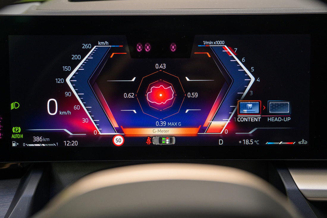При переключении меняется как поведение машины, так и оформление приборки. Даже изображение на проекции становится иным. Например, в Efficient («эффективный») на Head-Up-дисплее можно заметить кристалл со шкалой идеального вождения с точки зрения экономии (топлива или электричества). Невольно ввязываешься в игру «попасть в максимально эффективное значение».