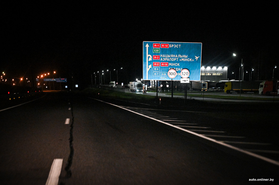 Любопытно, что M1, хоть и является заведомо транзитным маршрутом, многими используется в качестве основного, в том числе для не самых очевидных направлений. Из Минска в Витебск вы как поедете: по витебской трассе M3 или по «олимпийке» до развязки, что под Оршей, а оттуда на север? А сколько тех, кто из Минска добирается в Смолевичи, Жодино, Борисов не напрямик, мимо Кургана Славы, а в объезд по M1, полагая, что так быстрее, пусть километраж и побольше? Мы по M1 возвращались в Минск из Могилева, и в этом был умысел. Брестскую трассу от МКАД-2 до Бреста мы уже осматривали, настал черед изучить «олимпийку» в обратном направлении — вот и пришлось делать крюк: доехали до российской границы, развернулись и оттуда рванули до самой развязки с трассой M2, ведущей к главному аэропорту страны.