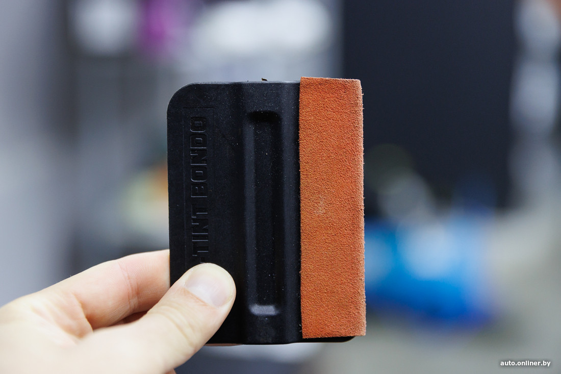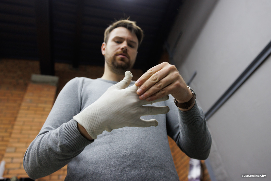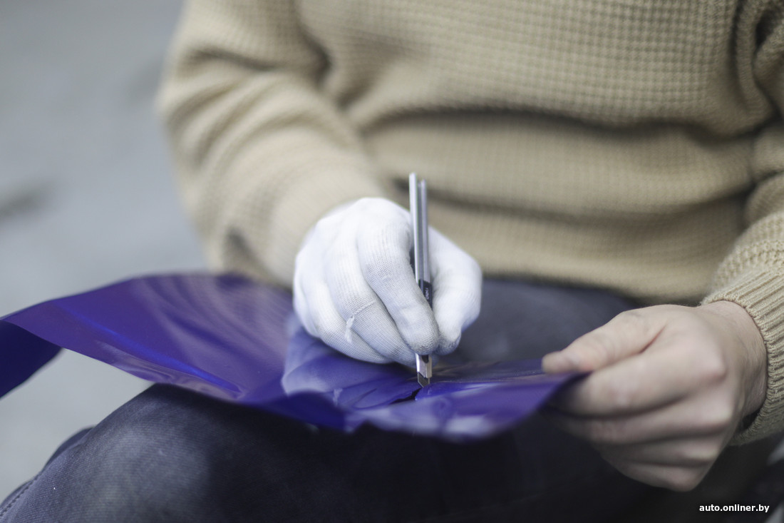 Потом — непосредственно сама оклейка. Работа непростая, требующая сноровки, терпения и особой температуры в помещении (не менее 20 градусов). Наклеить пленку на большой элемент, используя ракели, — это не ролик на YouTube посмотреть. Говорят, получается далеко не сразу: поначалу уходит немало нервов, забракованный материал идет в корзину. Позже оклейщик набивает руку, начинает понимать, как ведет себя тот или иной материал, обзаводится нужным инструментом. Основным же орудием его труда остаются ракели с разными накладками из мягкой алькантары (чтобы не царапали пленку) и бесшовные антистатические перчатки.