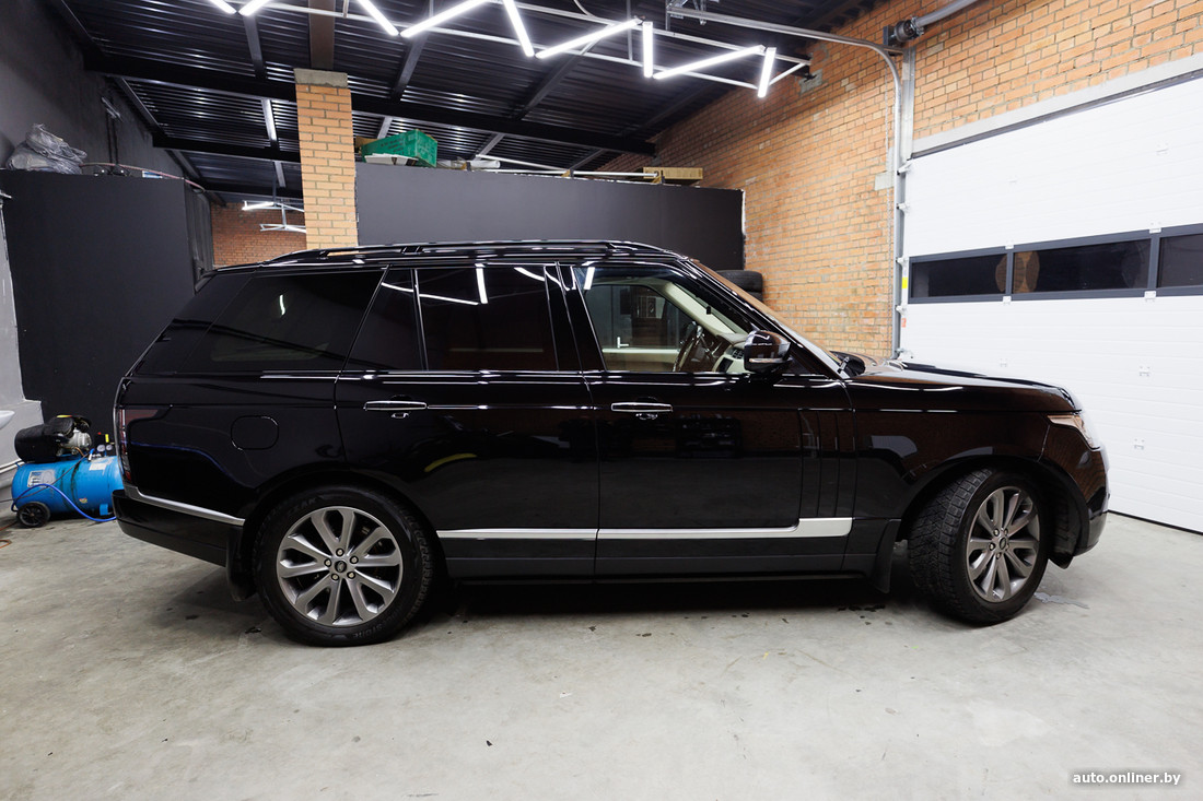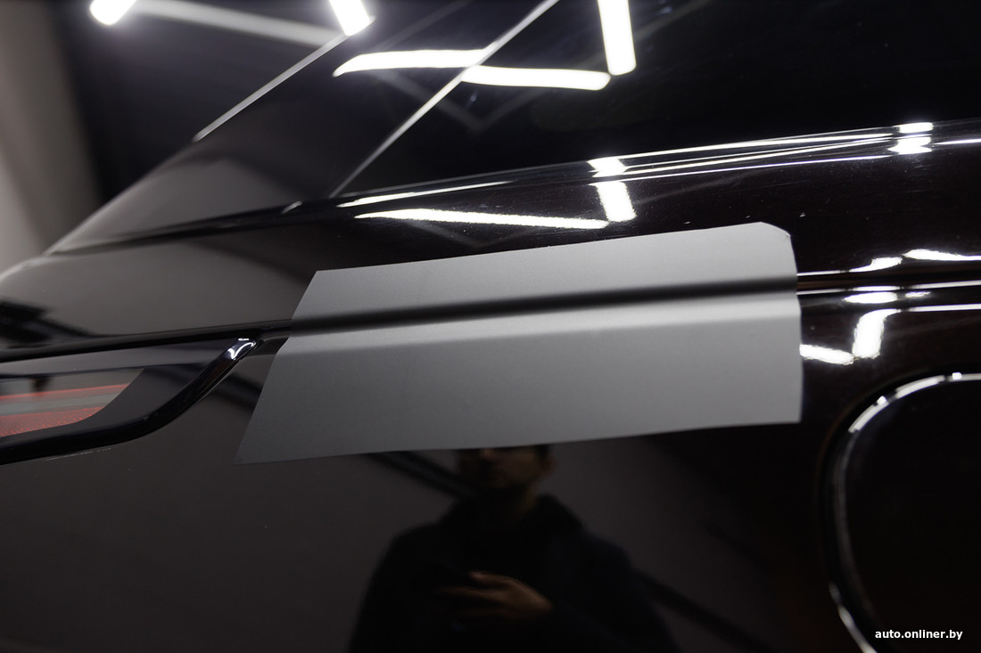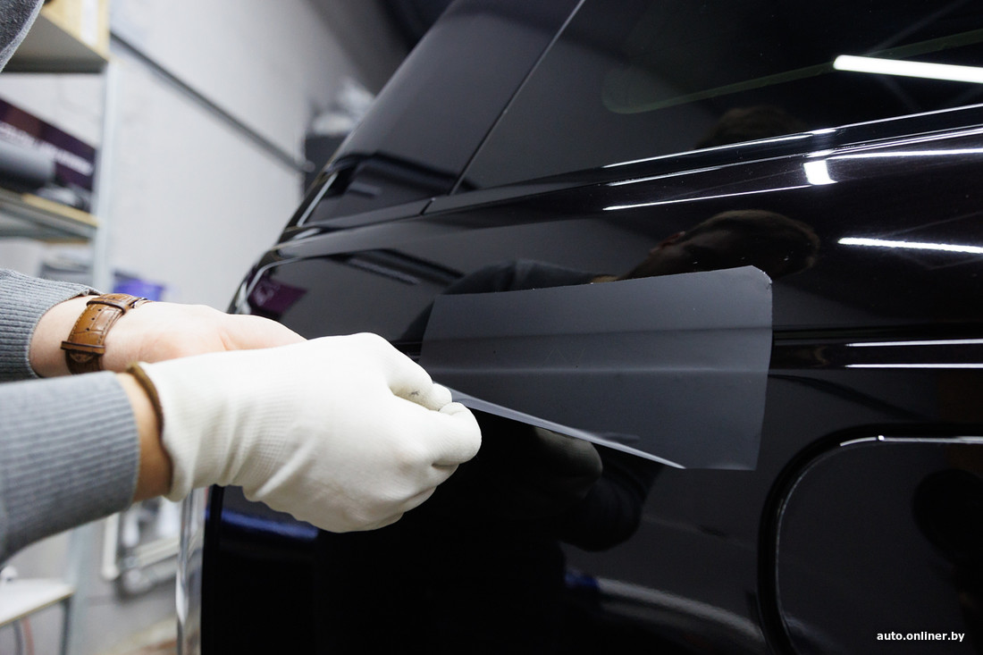 Винил, который будут использовать для этого Range Rover, не несет защитной функции. Его задача — эстетика. Но внедорожник уже прошел оклейку прежде — защитным полиуретаном SunTek из США еще при выдаче у дилера 8 лет назад. То есть сейчас мастерам предстоит снять уже нанесенную пленку и заклеить нижнюю часть кузова винилом, а на бампер поверх первого слоя пленки вновь нанести полиуретан. В противном случае винил быстро посечется, покроется сколами. Два слоя «зоны риска» приходится делать в случае, когда среди палитры полиуретановых пленок нет нужного цвета. По словам специалистов, бывали случаи когда двойным слоем (сначала винил, а поверх полиуретан) покрывали весь кузов, например для бизнес-такси. Их владельцы решили заняться извозом, а кузова автомобилей не соответствовали требованиям по цвету (например, были синими) — спас матовый черный винил.