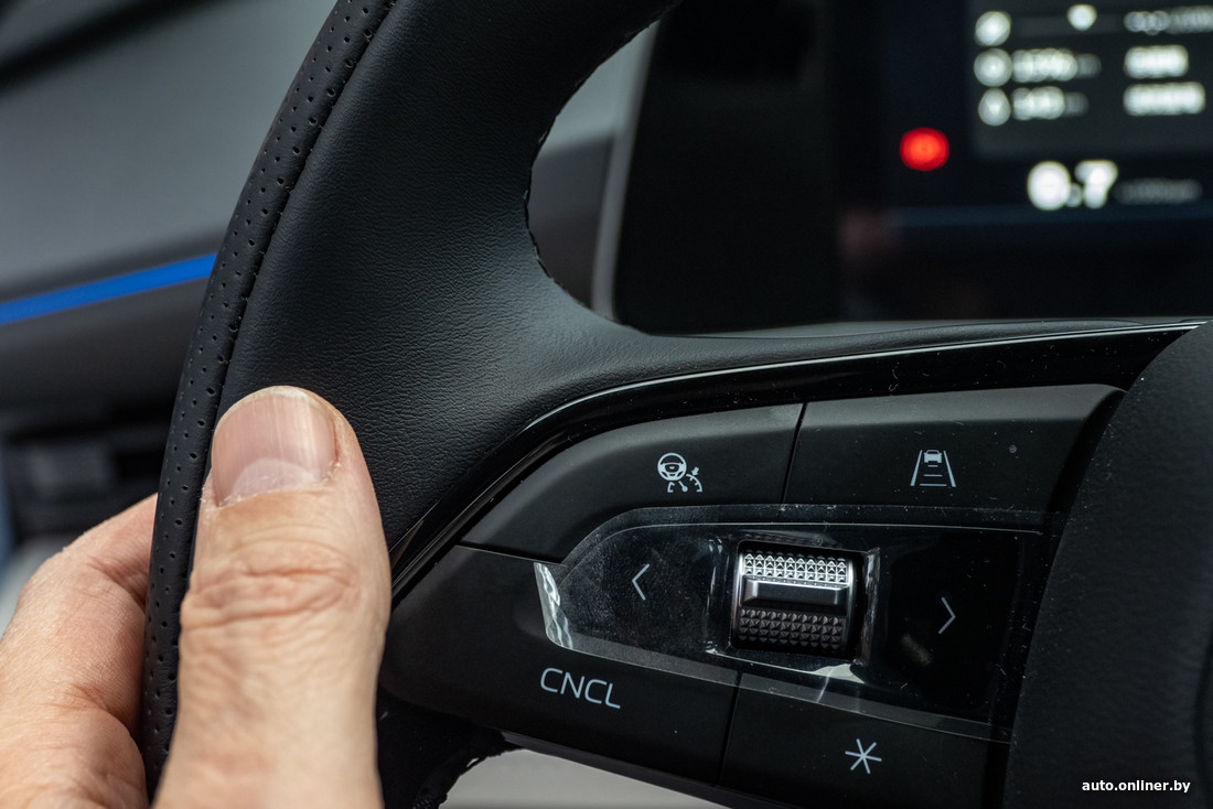 Что не нашли, так это проекции, подогрев лобового стекла и руля. Кстати, о руле — он довольно удобной формы: D-образный снизу и как бы скошенный сверху. На нем же — кнопка включения адаптивного круиз-контроля, настройка допустимой дистанции и т. п. С обеих сторон — колесики, как в компьютерной мышке. Для регулирования громкости — отличное решение.