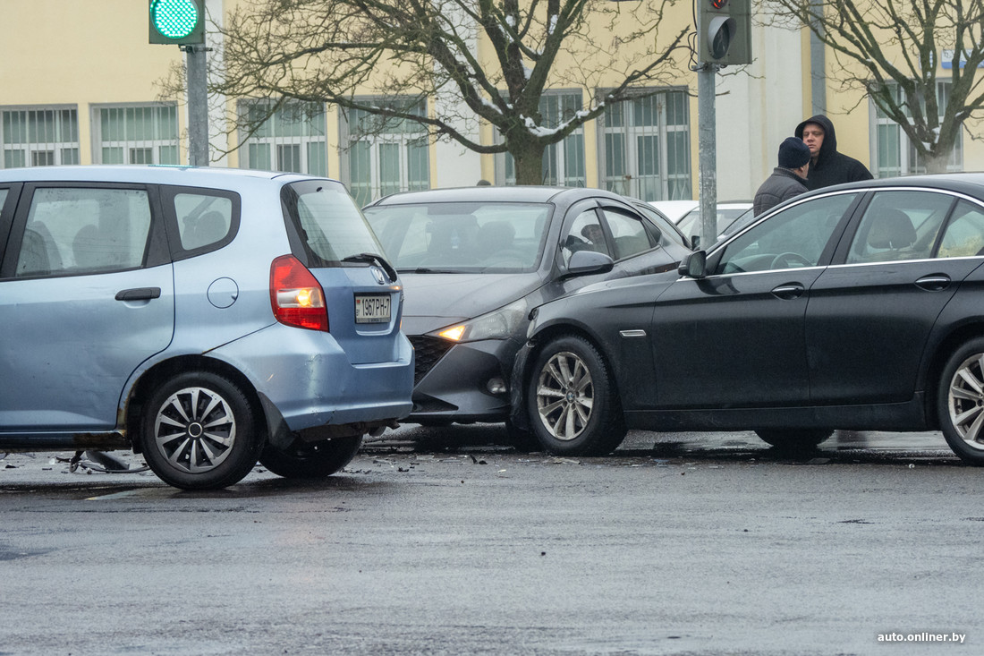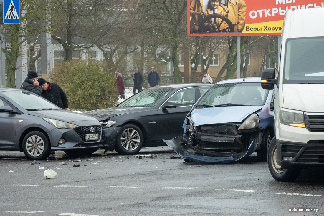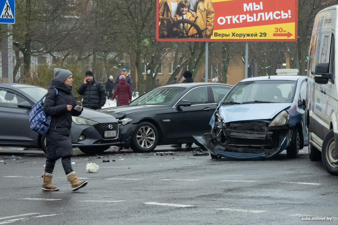 — Сегодня около 14:00 водитель Honda при повороте налево с ул. Старовиленской на ул. В. Хоружей не уступила дорогу встречному BMW и совершила с ним столкновение. По инерции последний повредил стоящий Hyundai, — прокомментировали аварию в ГАИ.