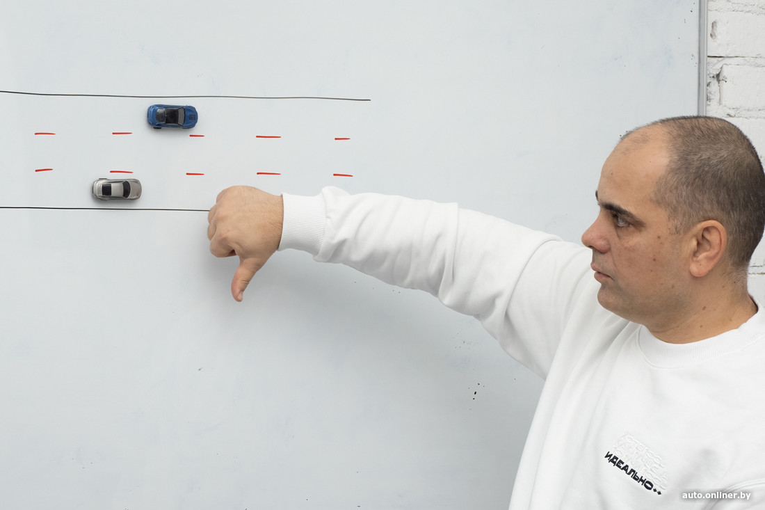 — Подлость ситуации в том, что один водитель догонял другого. Им было бы проще, если бы автомобиль справа находился чуть впереди, а не позади того, что слева, или если бы они ехали вровень. Темное время суток, горят фонари, водителям в принципе бывает сложно правильно оценить обстановку на дороге: смотришь по зеркалам, и может создаться иллюзия, что ты видишь не один автомобиль вблизи, а два маленьких на каком-то значительном расстоянии. Тяжело ориентироваться, сложно оценивать скорость приближающегося транспорта, — говорит инструктор.