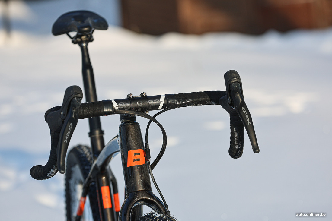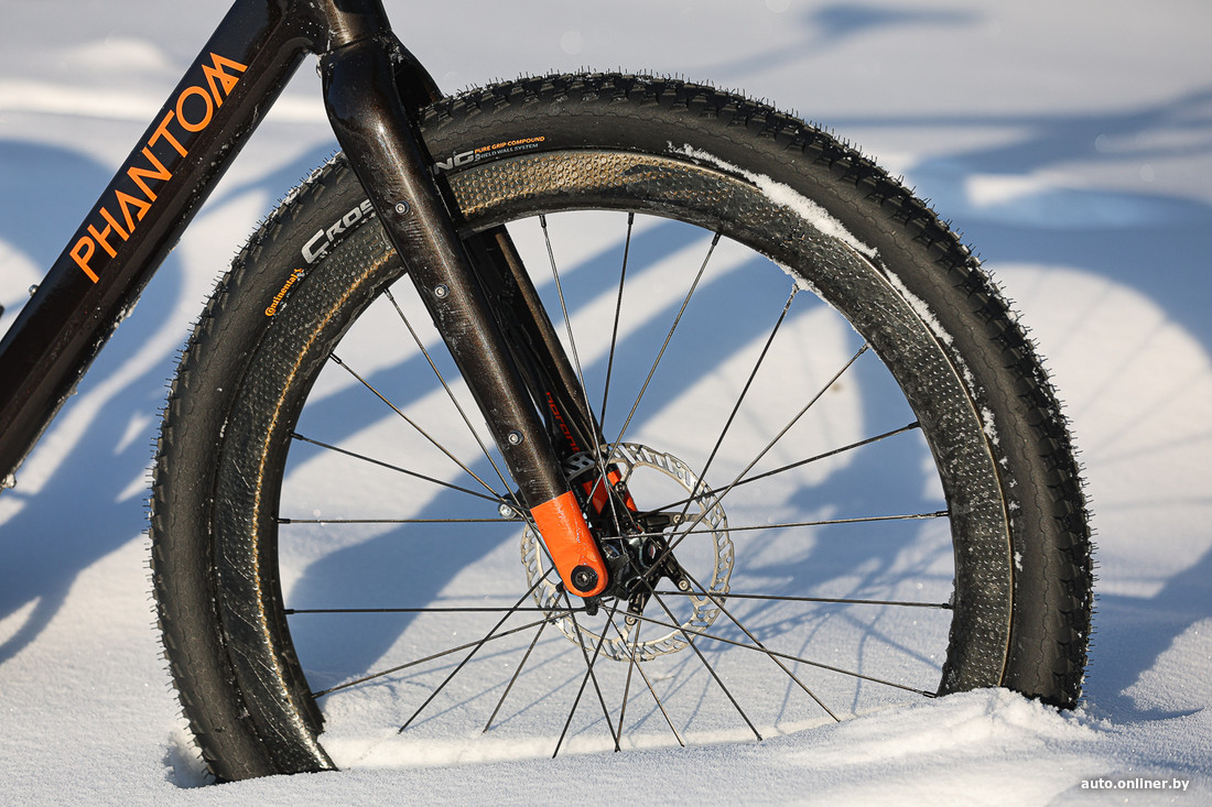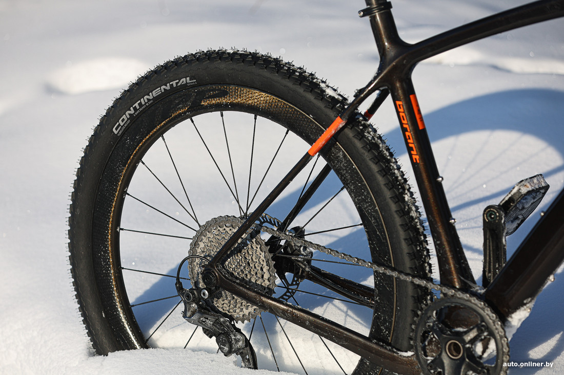 Тяготея к шоссейному велосипеду, мы выбрали не MTB, а гравел. Хорошо знакомый нам Borant Phantom белорусского бренда. Прежде мы не раз обкатывали первое поколение этой модели — быстрое, накатистое, все как надо. Обновленный «Фантом» адаптирован для дальних поездок и даже велотуризма, появились бонки для крепления дорожных сумок. У нас же не вполне стоковый вариант: к примеру, получили среднепрофильные карбоновые Zipp, на которые установили внедорожную резину от Continental шириной 2,2 дюйма. Zipp — как хотите, а вот пару широких покрышек на зиму увлеченный велосипедист наверняка сможет себе позволить. Вот чем хорош гравел: хочешь — оставь вседорожные покрышки, хочешь — используй слики для шоссейных заездов или даже грязевую резину — для неизведанных троп и зимних покатушек. Для понимания: на шоссейник или какой-нибудь гибрид такая резина не станет, зазоров не хватит.