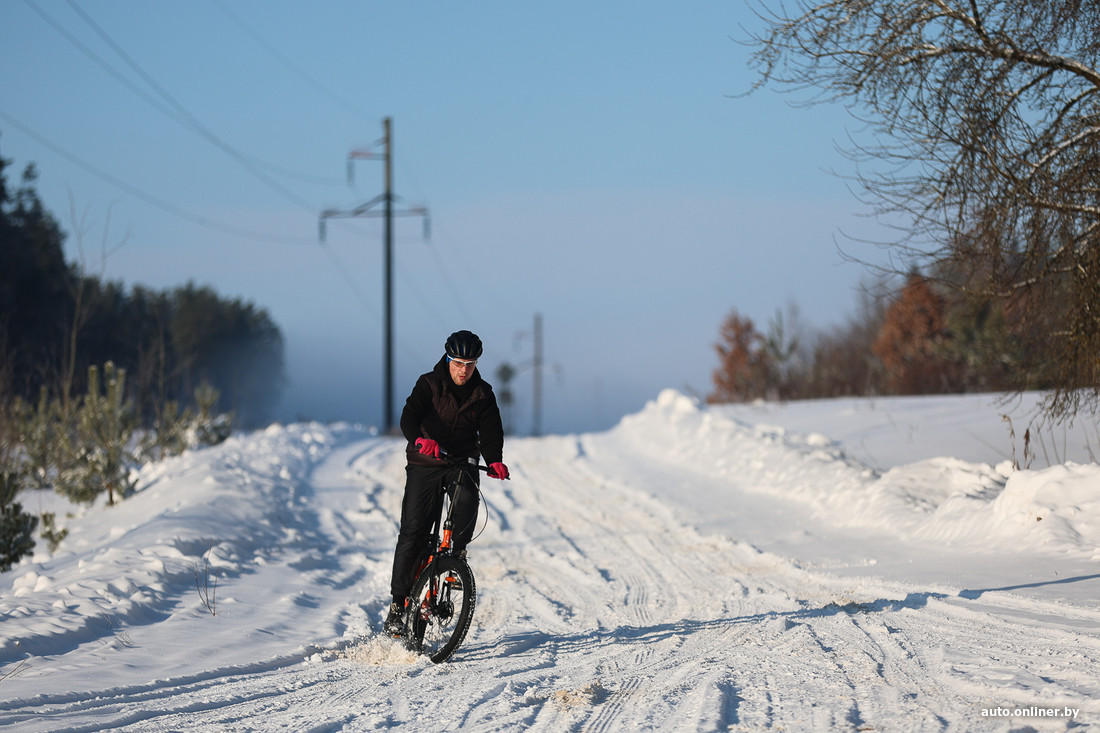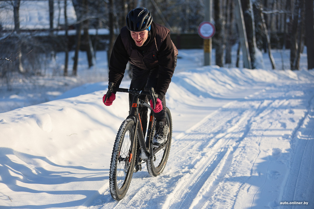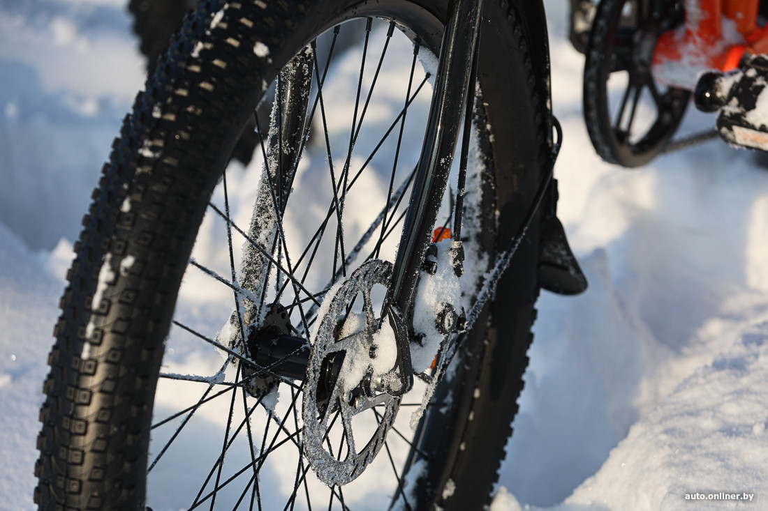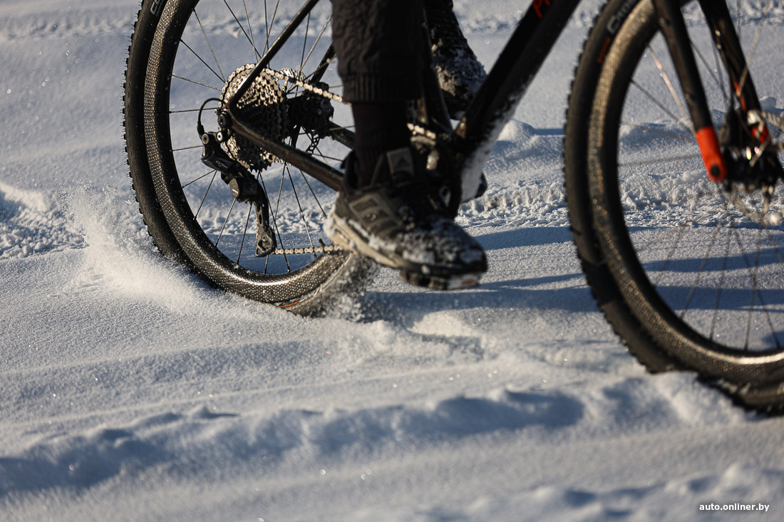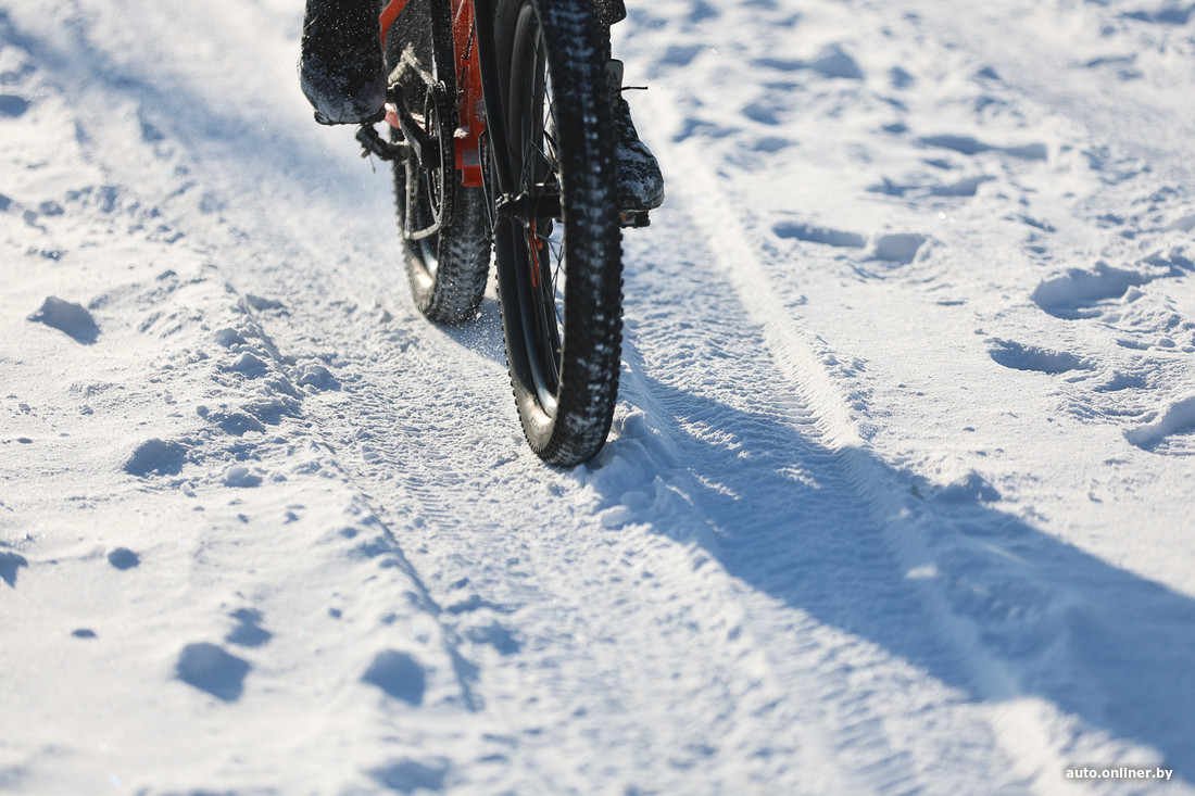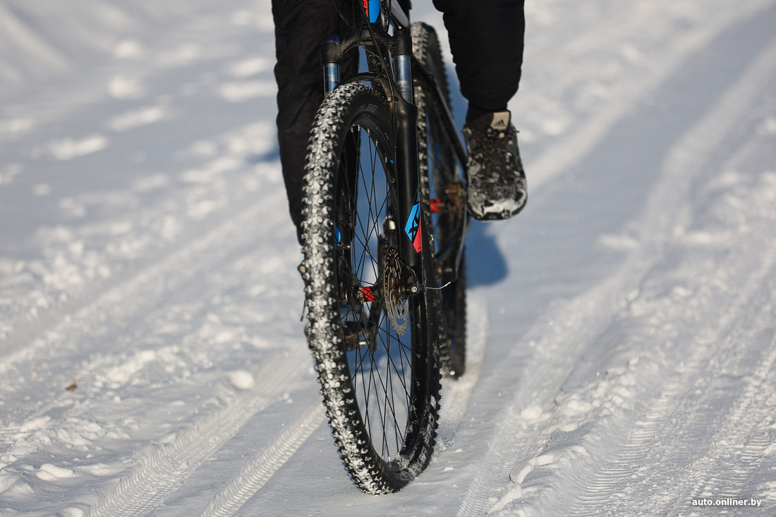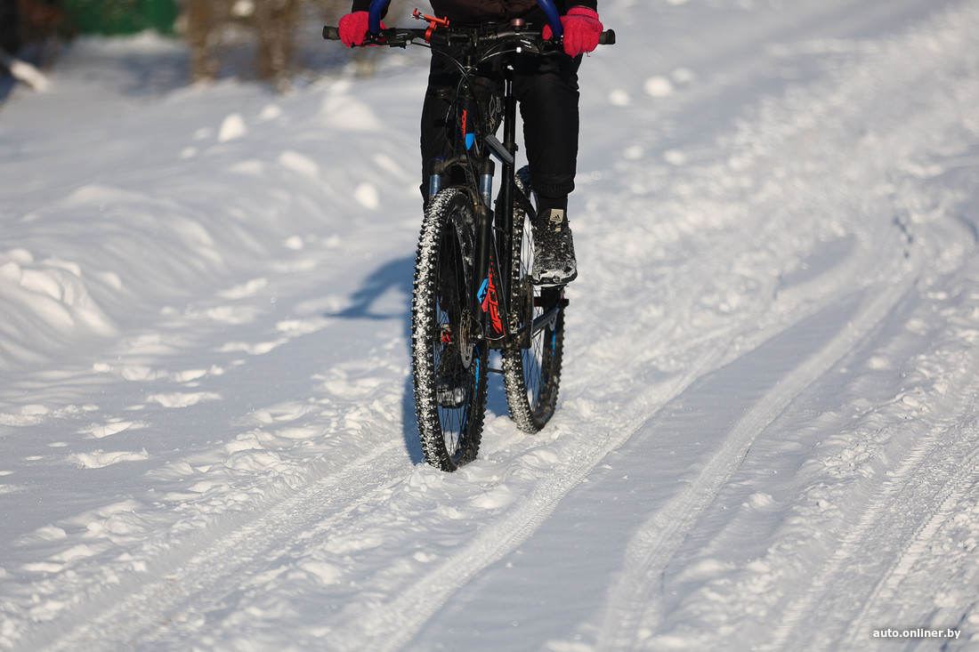 Но резина не шипованная, а 2,2 дюйма — примерная история массового MTB (посмотрите, что у вас на горнике). Ну и каково на этом ехать по сугробам? Мы попробовали.