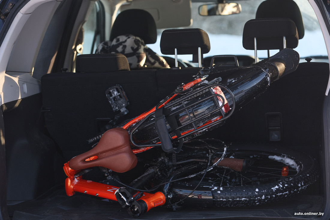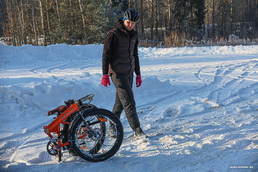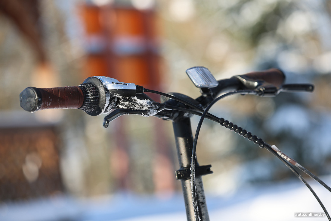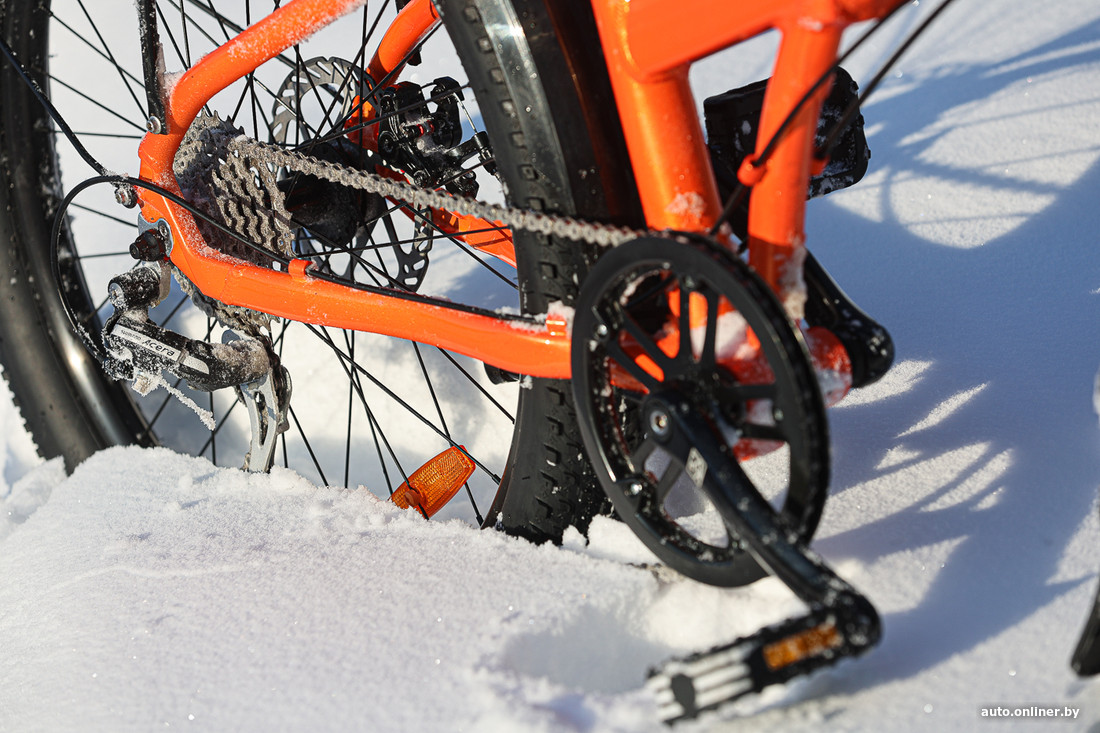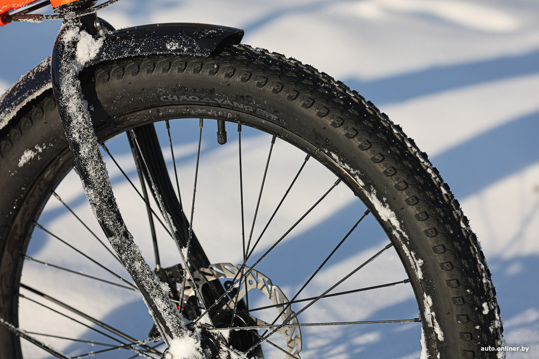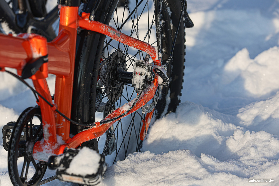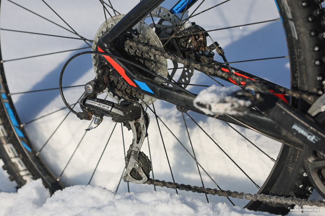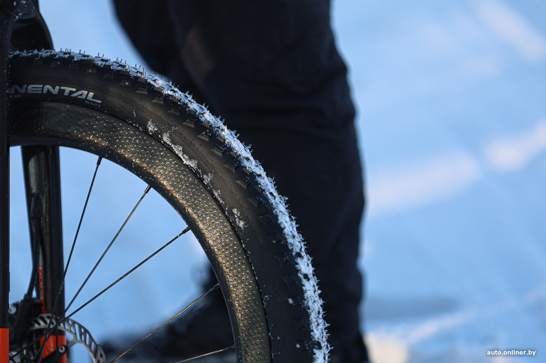 Но резина не шипованная, а 2,2 дюйма — примерная история массового MTB (посмотрите, что у вас на горнике). Ну и каково на этом ехать по сугробам? Мы попробовали.