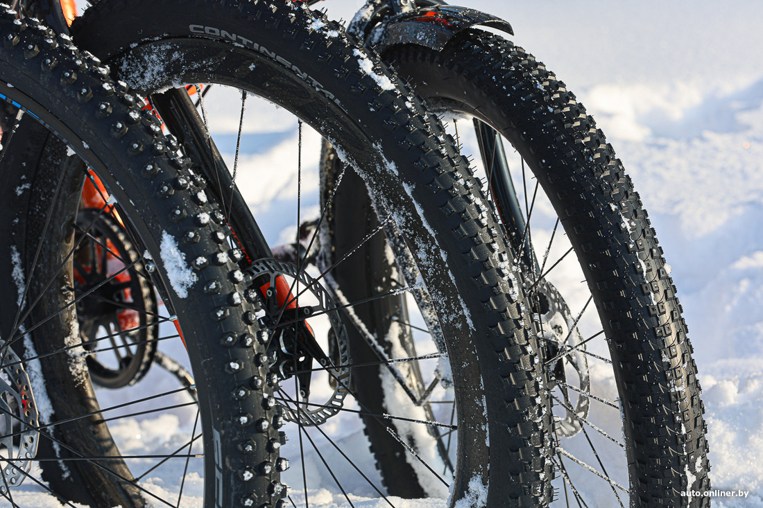 Вариант номер два: тот самый обыкновенный МТB, велосипед массовый и всеми любимый, если судить по тому, на чем катаются по городу в сезон. Изменение одно, но принципиальное: установили шипованную резину. Если видели такую на автомобилях, хорошо представляете суть: в резиновый протектор внедрены металлические шипы, не острые, но цепкие, по 402 шипа на покрышку — ультимативный вариант.
