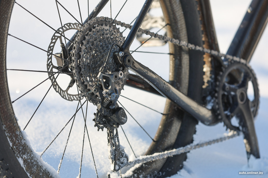 Обкатаем три велосипеда, как три философии зимнего катания. Первый вариант: велосипед со злой резиной в 2,2 дюйма. Ничего, в принципе, особенного, это примерно то, что в базе установлено на вашем горнике. Но у нас гравел, и резину мы переставили (в стоке была более дорожная, узкая, зато накатистая).