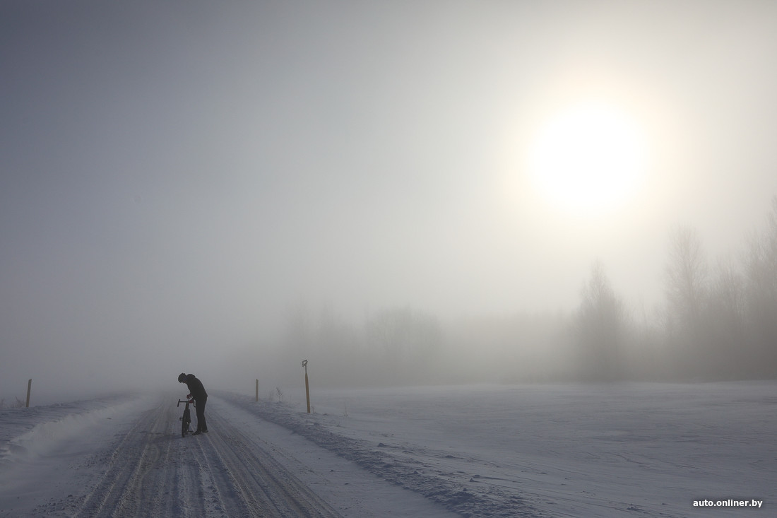 Мы уезжаем из города с его хорошо расчищенными тротуарами туда, где край проезжей части иногда можно определить лишь по специальным столбикам, туда, где туман льется с неба будто парное молоко из стакана. Какой там горизонт, если за пределами вытянутой руки уже ничего не видно — белым-бело, куда ни глянь. При этом снегопада нет, как нет и гололедицы, — лишь снег толстенным покрывалом, а уж что под ним — узнаешь по сносу заднего колеса.