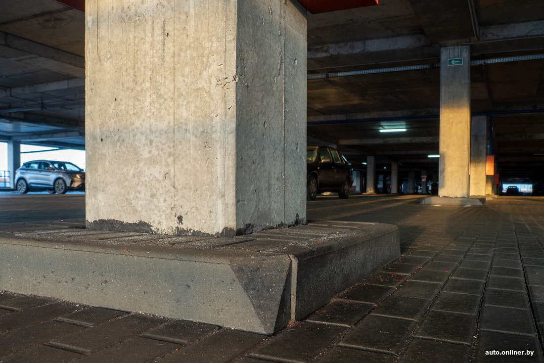 На паркинге есть участки, где покрытие откровенно нуждается в ремонте. Бетон наверняка убивает погода: рядом открытый проем — задувает. Вроде и мелочь, но это портит общее впечатление.