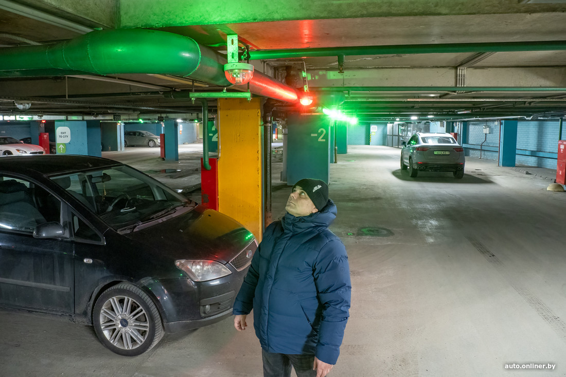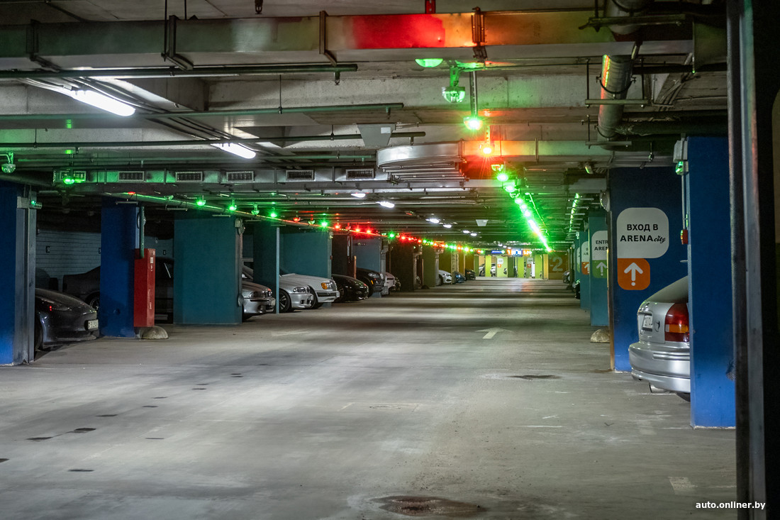 Но тут мы присмотрелись повнимательнее. Места узкие, кое-где видна разметка. Однако индикаторы свободного места — зеленый или красный — горят как-то странно: два через один. И тут приходит догадка: там, где было как бы три места, теперь их два. На паркинге Arena City решили проблему крайних мест в вагоне метро: там, где трое нормально не помещаются, теперь два места.