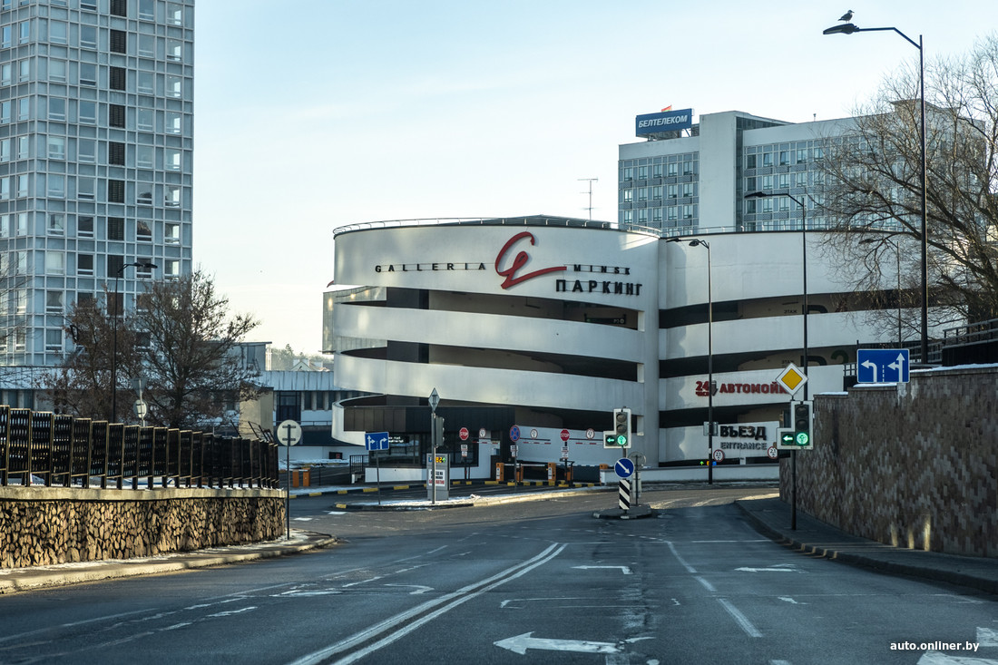 Паркинг ТЦ Galleria Minsk на проспекте Победителей выделяется на фоне всех других, потому что парковочные места расположены здесь не под прямым углом, а как бы наискось. Считается, что так проще парковаться. Кроме того, такое решение позволяет сэкономить место. Над созданием паркинга, к слову, работал немецкий проектировщик Илья Ирмшер.