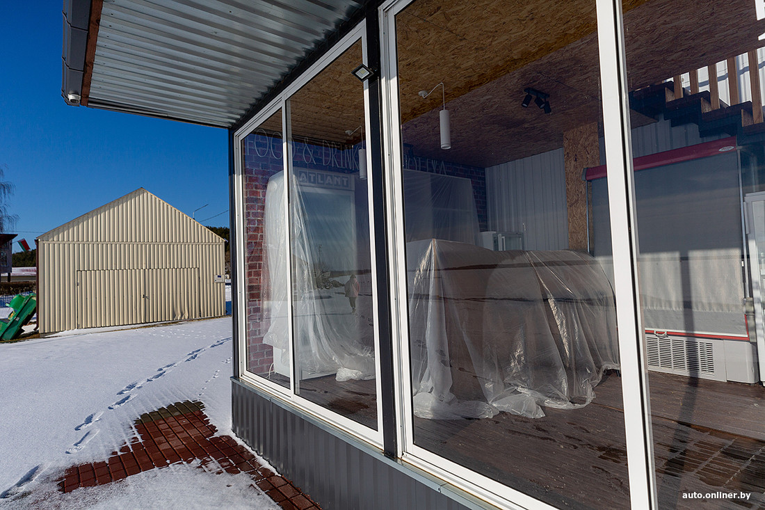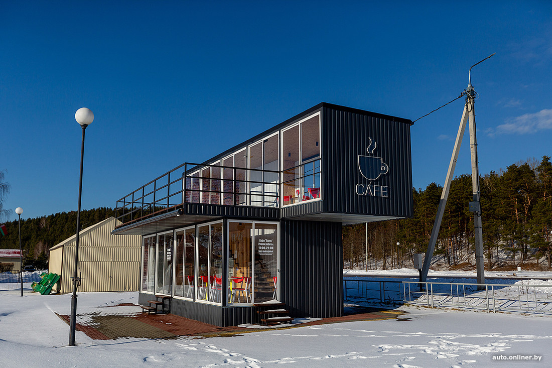 Замечаем на берегу симпатичное кафе с окнами в пол и яркими стульями. Летом сюда будет не пробиться, ну а пока техника накрыта полиэтиленом. Есть пункт проката спортивного снаряжения. Нужно звонить.
