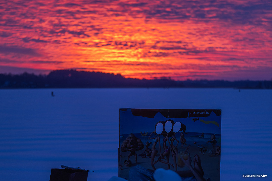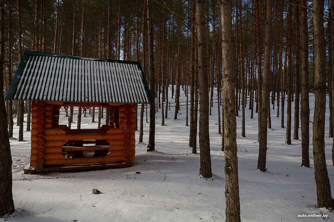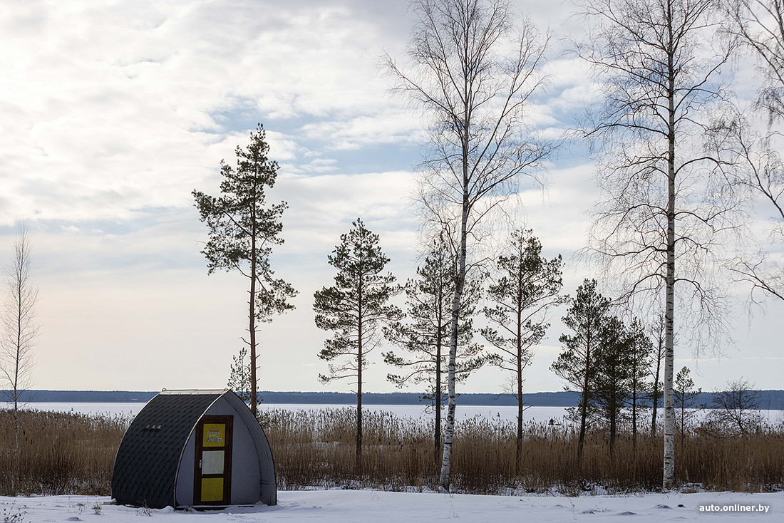 Браслав встречает нас февральским солнцем и пустыми туристическими стоянками. К платным беседками перед въездом в город (лайк за то, что деньги можно перевести прямо на месте по QR-коду) не ведет ни один след, кроме косулиных копыт на снегу. Но при этом на озере, давно покрытом льдом, многолюдно: рыбаки «соревнуются» в многообразии палаток и удочек.