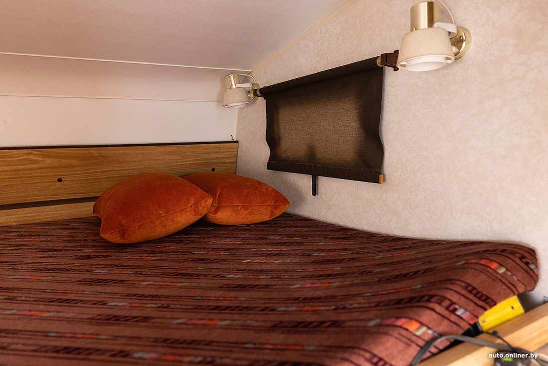 — Вы можете сами выбирать вариант отопления, — рассказывает владелец. — «Сухой» печкой можно обогревать только салон, а «мокрая» предполагает различные вариации. Она может греть только воду для мытья посуды, а может греть батареи, установленные внутри. Также внутри установлены аккумуляторы, но энергию можно забирать и от внешней сети, если, к примеру, стоите на оборудованной стоянке. Холодильник «питается» от газа. В общем, предусмотрена полная автономность.