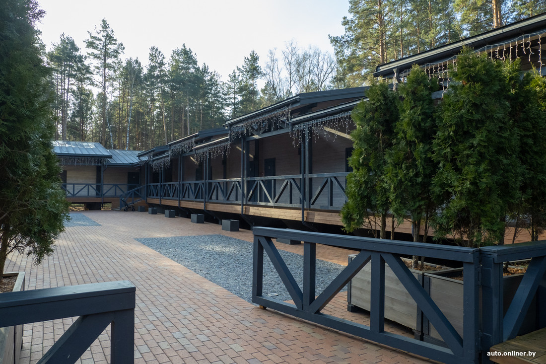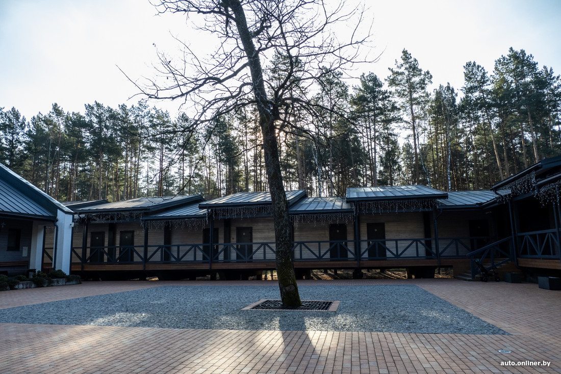И спустя полчасика, как выехали из большого города, окончательно сворачиваем в сосновый лес. По сути это опушка достаточно большого массива под названием Прибужское Полесье. Дорога ведет прямиком к озеру, у которого и примостилось шале: приземистые деревянные постройки с сонно прикрытыми ставнями. Взгляд притягивает главный зал — ресторан. Весь фасад остеклен, благодаря чему создается эффект перетекания пространства, не отчужденного от леса, а будто бы его дополняющего.