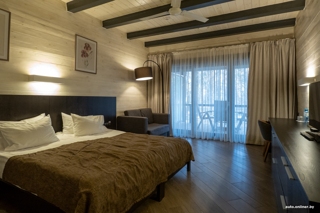Как только появилась такая возможность — заглянули в освободившийся номер. Лаконично, в том же стиле: большая кровать, удобства, деревянная мебель, балки. Летом здесь не должно быть жарко. Терраса с видом на сосняк — это то, на что легко можно променять любой ресторан, по крайней мере на время завтрака.