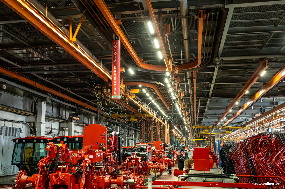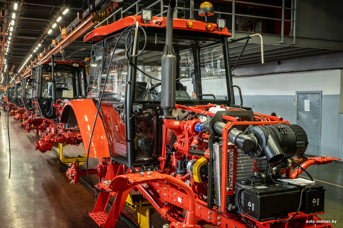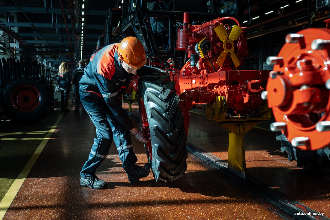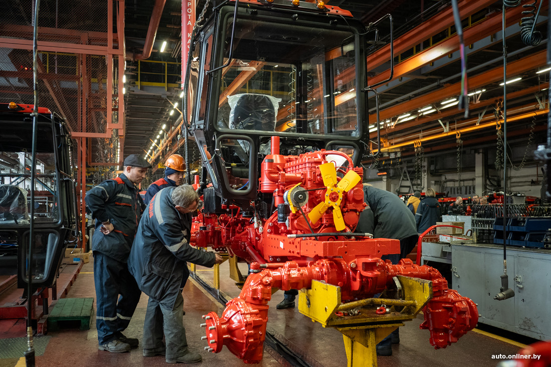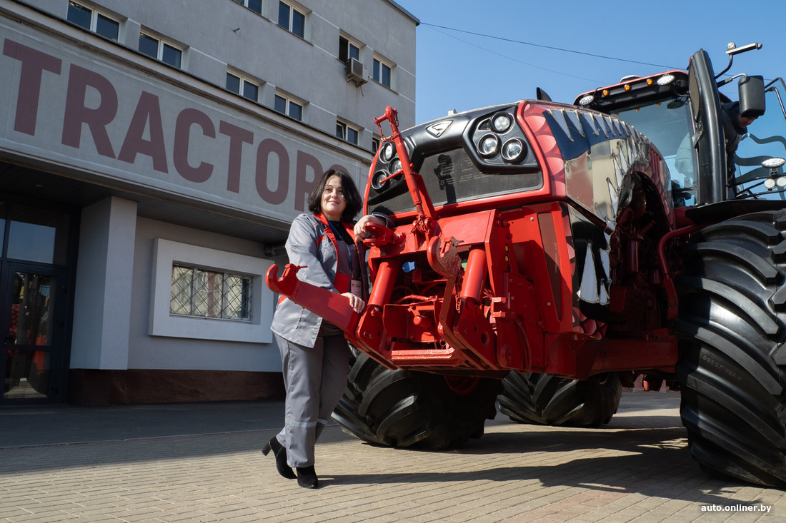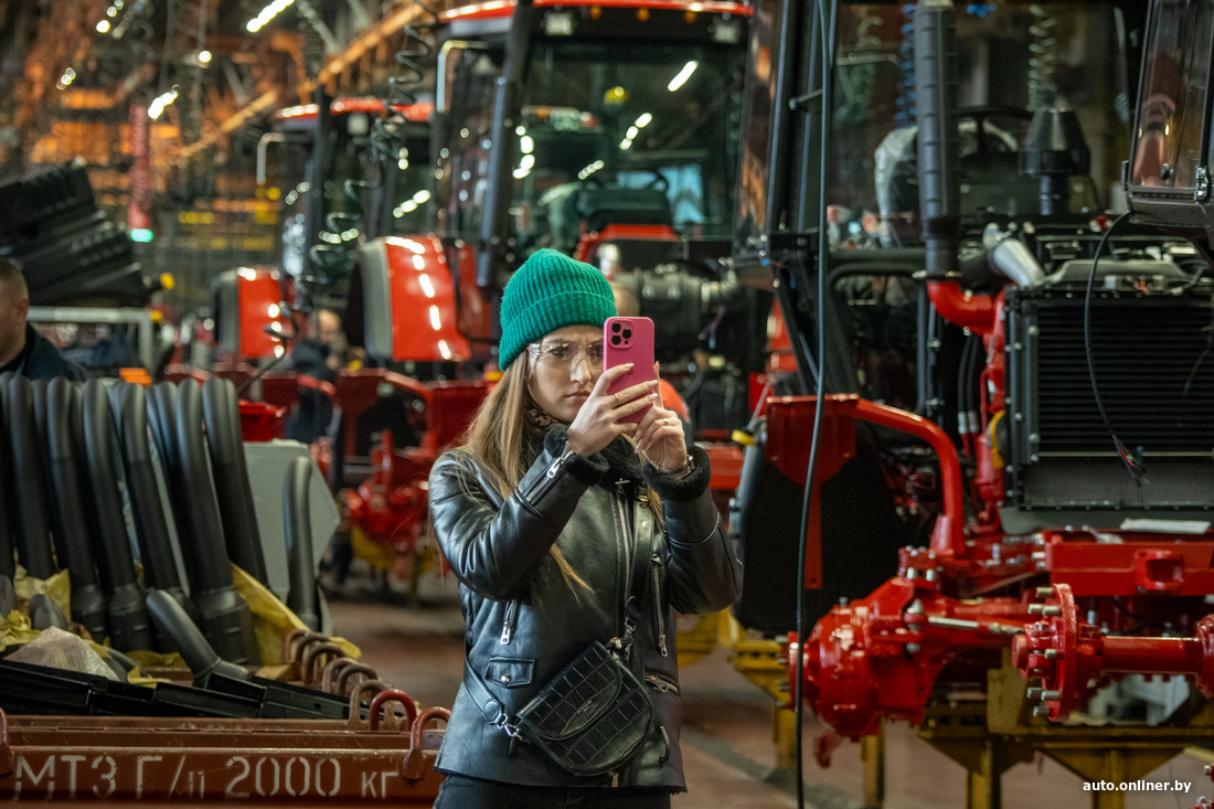 Кстати, а почему практически все тракторы — красные? Как объясняет экскурсовод, в советские времена в красный цвет красили экспортные тракторы, которые уходили за рубеж, а техника для внутреннего рынка была синей. После СССР такой подход перестал существовать, а у МТЗ было сформировано три фирменных цвета: красный, синий и зеленый. Ну а с этого года принято единое решение. Тракторы красят в красный цвет, коммунальную технику — в оранжевый, лесозаготовительную — в зеленый. А под заказ трактор может быть любого цвета.