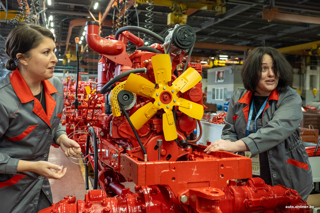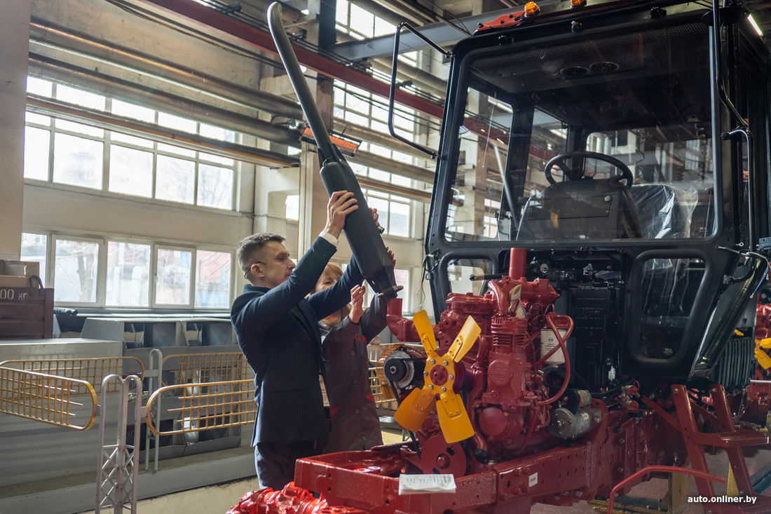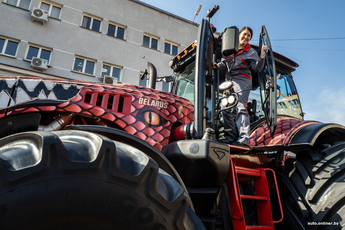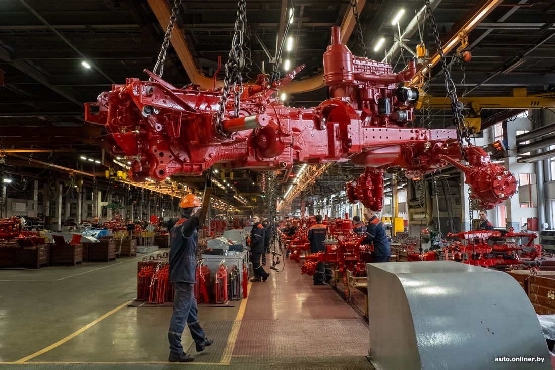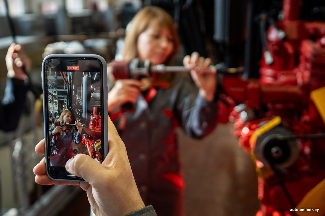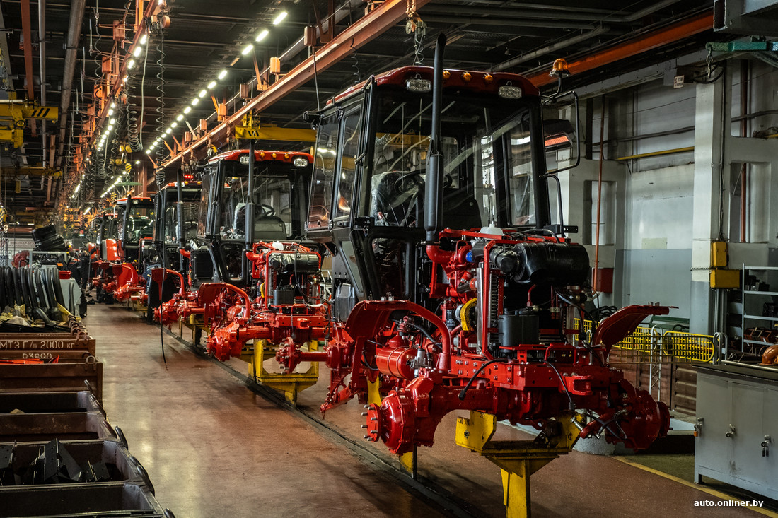 Кстати, а почему практически все тракторы — красные? Как объясняет экскурсовод, в советские времена в красный цвет красили экспортные тракторы, которые уходили за рубеж, а техника для внутреннего рынка была синей. После СССР такой подход перестал существовать, а у МТЗ было сформировано три фирменных цвета: красный, синий и зеленый. Ну а с этого года принято единое решение. Тракторы красят в красный цвет, коммунальную технику — в оранжевый, лесозаготовительную — в зеленый. А под заказ трактор может быть любого цвета.