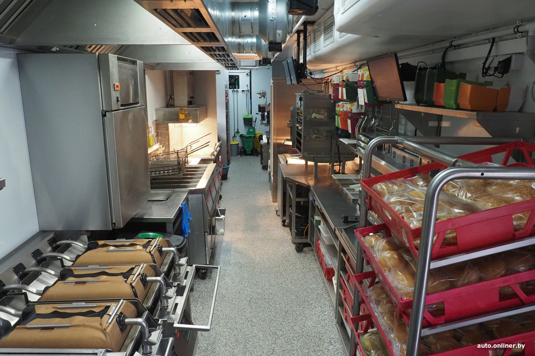 Прицеп выполнен в стиле традиционных точек Mak.by. Внутри можно готовить и хранить еду этой сети ресторанов.