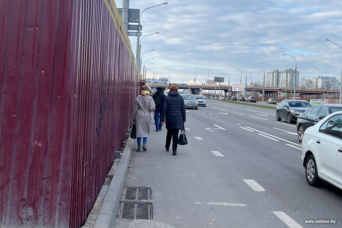 На столичной улице Домашевской, на участке от Кальварийской до Харьковской, убрали тротуар. Просто передвинули ограждение строительной площадки вплотную к проезжей части — и все, «прохода нет». Но пешеходы так не думают — и идут привычным маршрутом прямо по дороге.