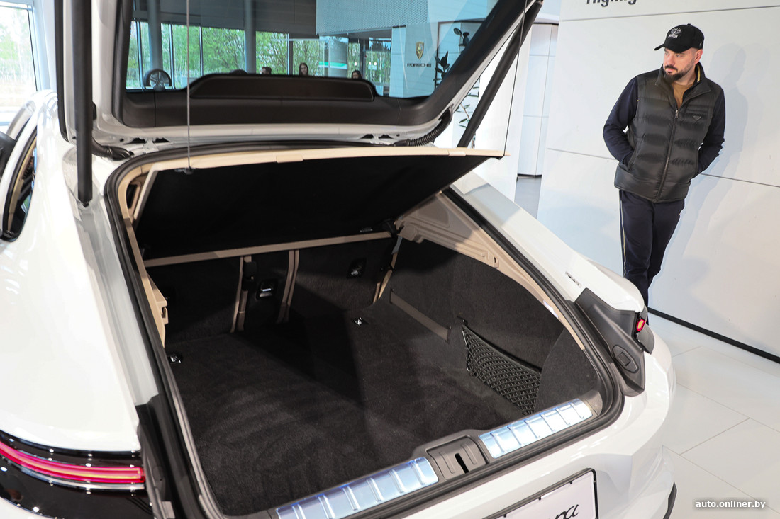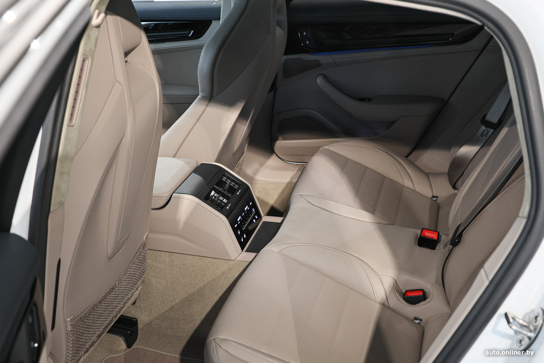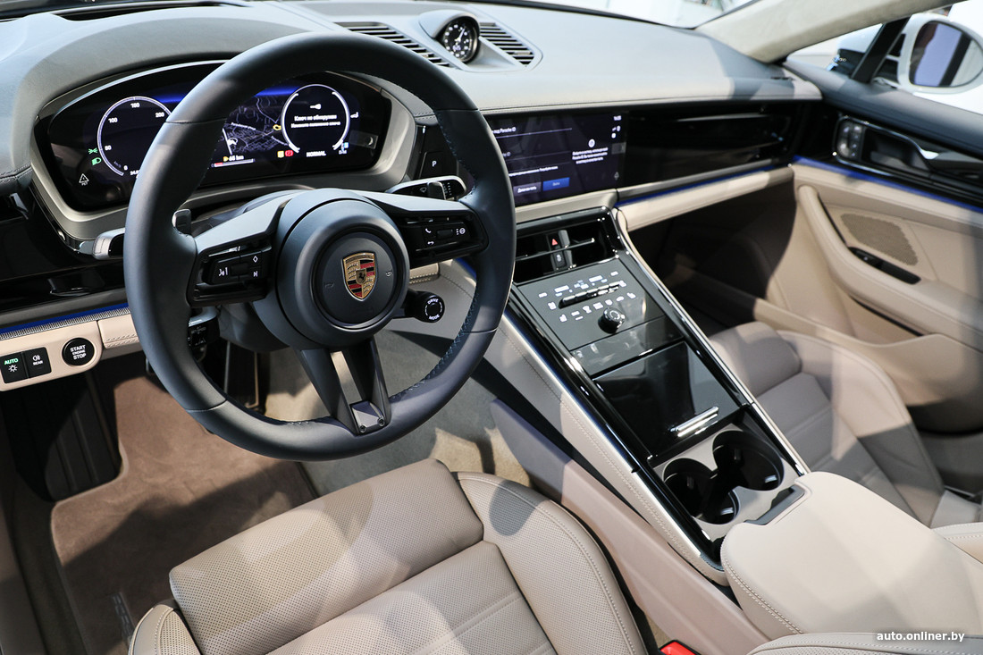 Интерьер решен в стиле Taycan, блок управления климат-контроля — сенсорный, но есть и несколько физических клавиш. В роли приборной панели выступает 12,6-дюймовый экран, а в центре расположен 10,9-дюмовый тачскрин мультимедийной системы. Покупатели могут выбирать различные варианты отделки салона, но в данном случае используется светлая алькантара.