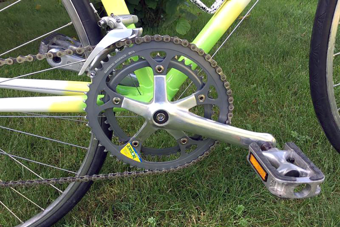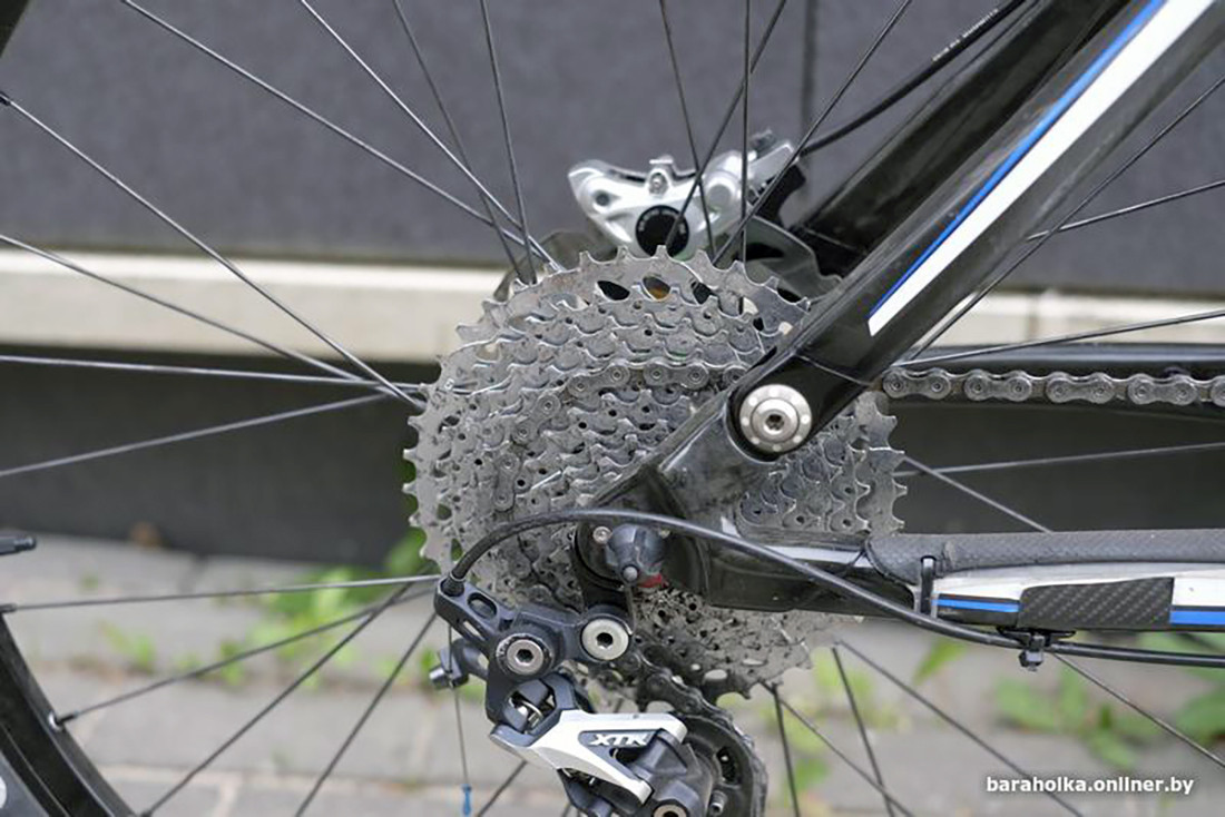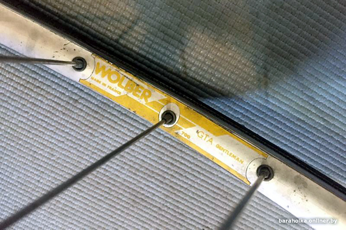 Навесное оборудование — Shimano 105, легендарная серия. Обода из тех времен (обратите внимание, сколько спиц на каждом колесе), хромолевая рама.
