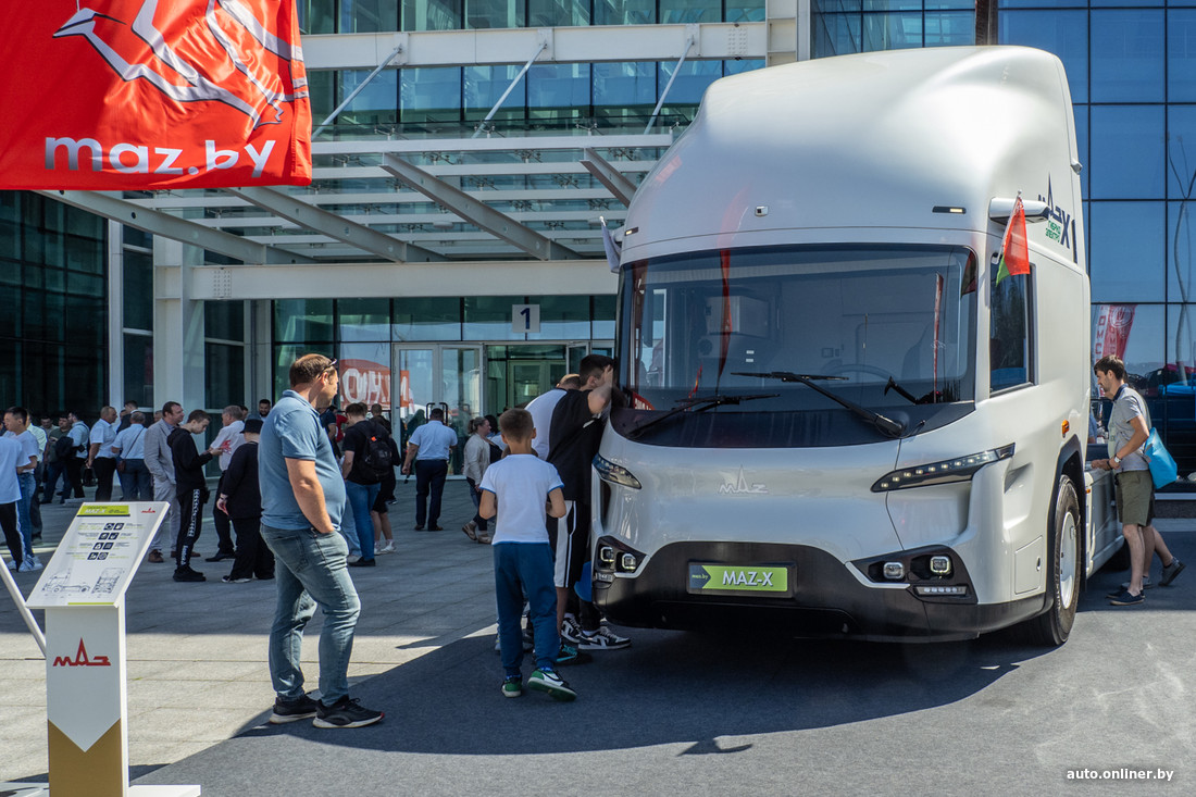 Выставка проходит 9 июня, так что еще можно успеть все увидеть своими глазами. В том числе тот самый МАЗ-Х, прозванный «МАЗом будущего». Тягач имеет трехмоторную гибридную установку. У него один дизельный двигатель мощностью 220 кВт (300 л. с), два электромотора по 200 кВт (272 л. с.) каждый. Запас хода — 3000 км. А буферный накопитель энергии с системой рекуперации дает дополнительные 10 км.