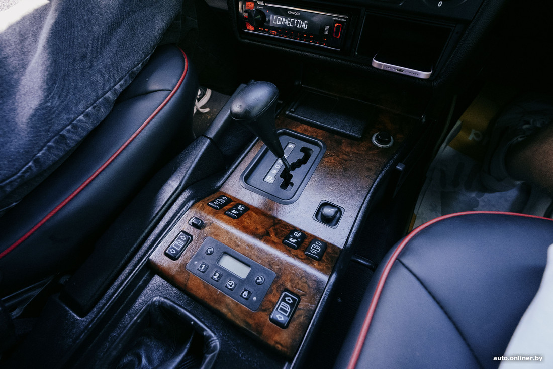 Двери по канону тяжелые. Сиденья, руль и карты перешиты. Под черно-красные оттенки подобраны и диски. Салон минималистичный по современным меркам, зато есть электростеклоподъемники (во время нашего экспресс-теста работали не все) и электроприводы передних сидений. А еще замечаем рычажок управления круиз-контролем. Но, увы, представитель салона предупредил, что опция не работает.