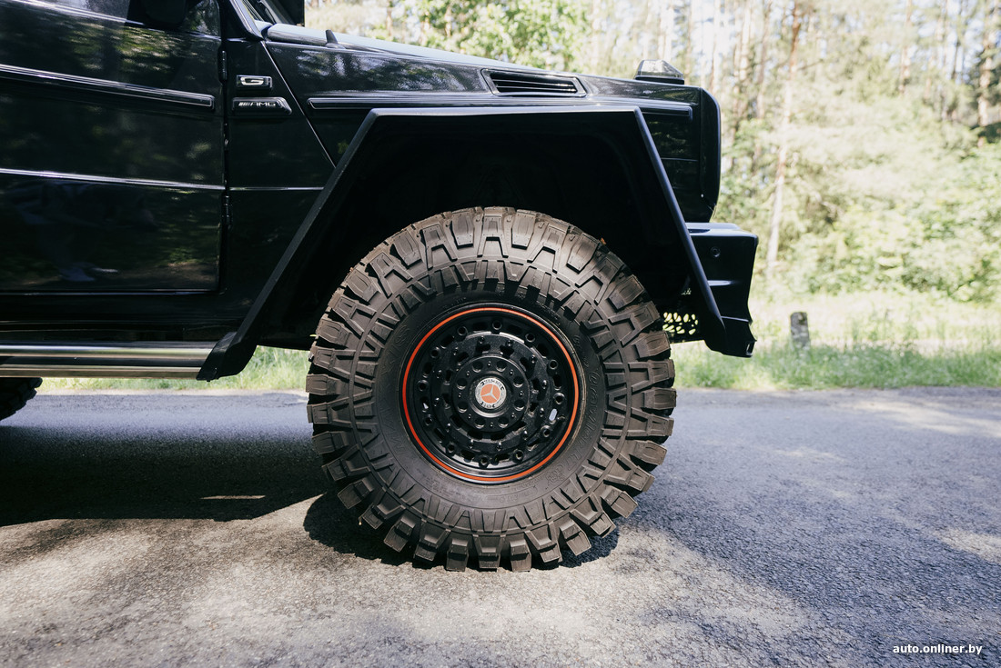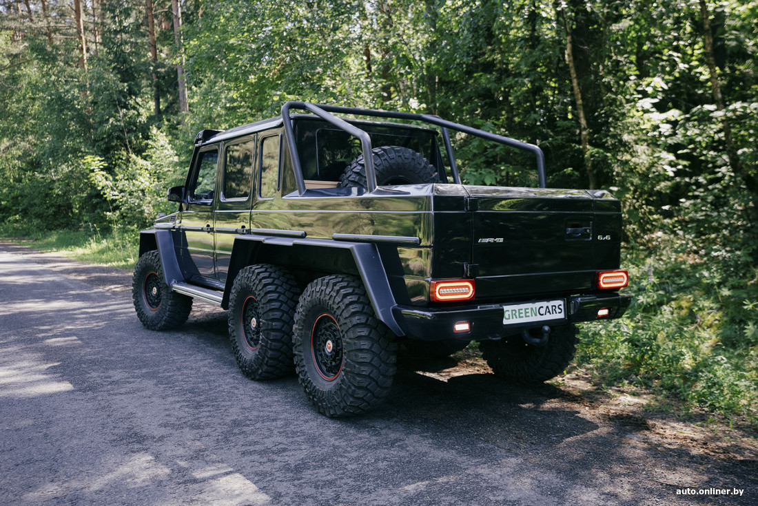 Но не поехать и не посмотреть на этого представителя G-класса мы просто не могли: это же 6-колесный пикап! Он появился в продаже у Green Cars и сейчас выставлен на площадке столичного автосалона.