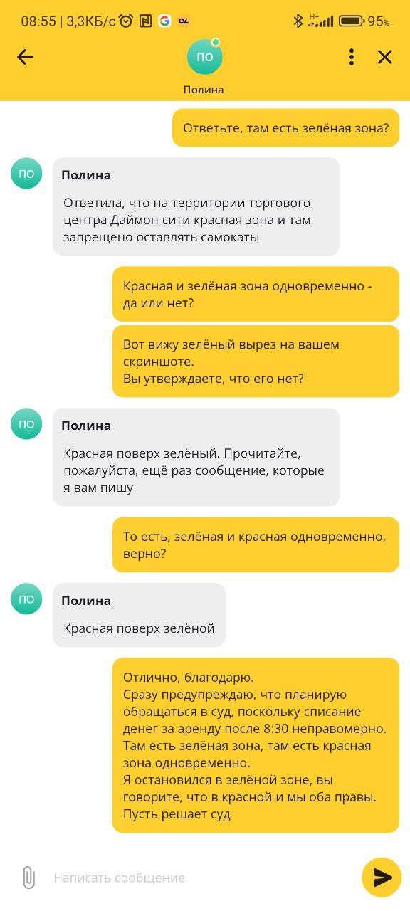 Пользователь: Ну вот же зеленый вырез на всю территорию торгового центра. Прямоугольник с запретом я вижу, самокат не находится в этом периметре. Он находится на территории зеленой зоны. Отчетливо видно, что красная и зеленая зоны закрывают одно и то же пространство. Вы считаете, там красная, я вижу, что там зеленая. Вы не определились с рисованием карт, это проблемы вашей организации, за которые я платить не буду. Аренда должна быть завершена в 08:30.