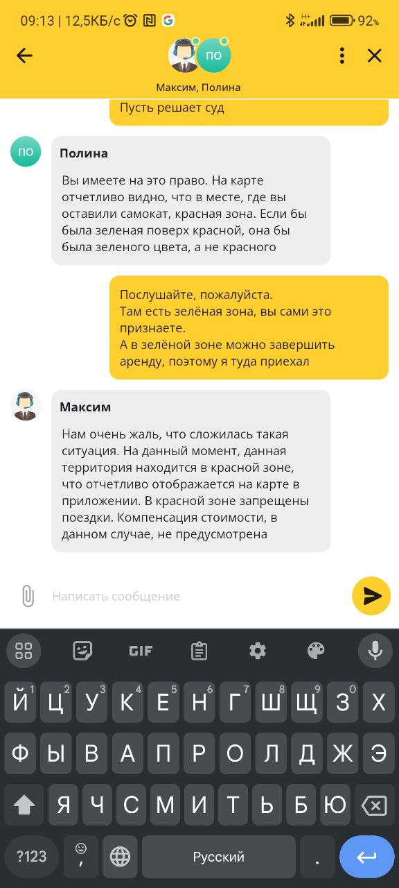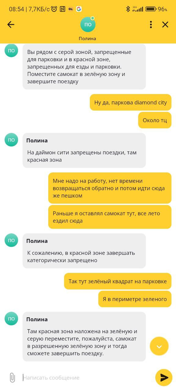 Если коротко: сервис нарисовал зеленую (оставить самокат можно) и красную (оставить самокат нельзя) зоны одновременно на одной территории, и наш читатель не смог завершить поездку. Поддержка стояла на том, что красная зона перекрывает зеленую, а пользователь утверждал, что обе зоны работают одновременно и это не его проблема. В итоге аренда завершилась только спустя 30 минут. За каждую минуту с клиента снимали деньги.
