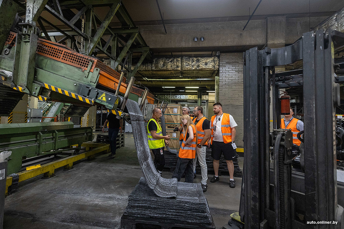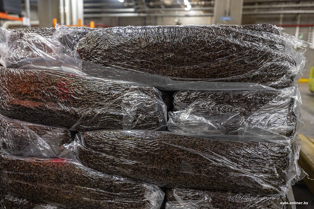 — Камера «миксера» имеет ограниченный объем — до 270 кг. На палете же у нас — около тонны. То есть на одном поддоне находится до 4—5 разных замесов. Каждый замес — это участие человека, поэтому не исключен человеческий фактор, ошибка, — говорит экскурсовод. — «Петельки» в стопке отделяют один замес от другого. От каждого отрезается кусочек и отправляется в лабораторию, где он проверяется на вулканизацию. Если хотя бы один замес на поддоне не получит допуск — весь палет в производство не идет. Конечно, ничего не утилизируется. Смесь измельчается и в малых допустимых пропорциях добавляется в новый замес.